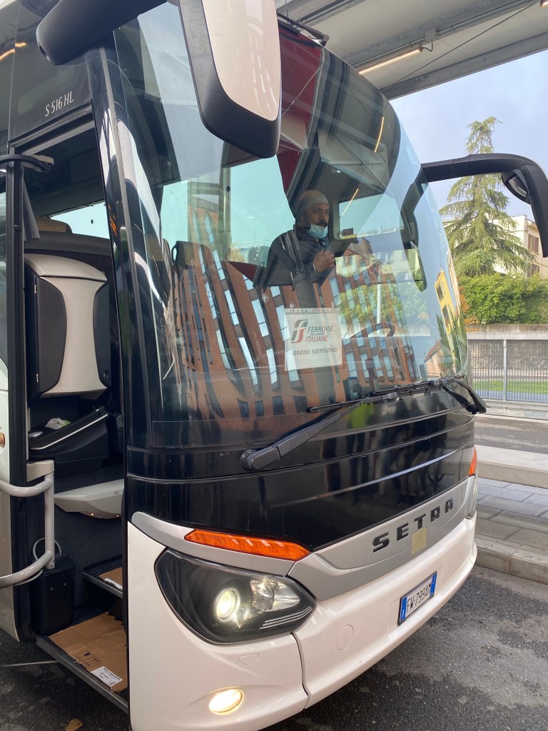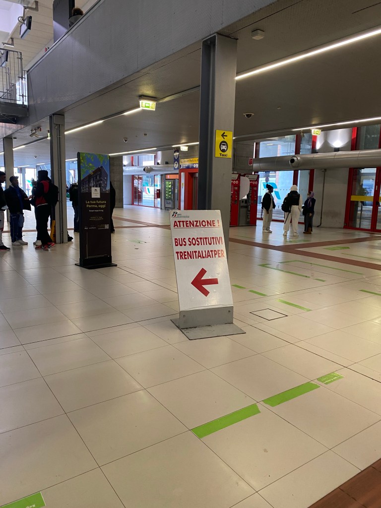 But this was different. I tried really hard to understand the announcements and knew that something big was up. I saw a nice mother and teenage daughter not far from me and asked them what was happening. They explained that the train could not go any further because of an accident on the tracks and that the train company, Trenitalia, had made arrangements for busses to take passengers from Parma to Fidenza, where we could presumably rejoin the train line.