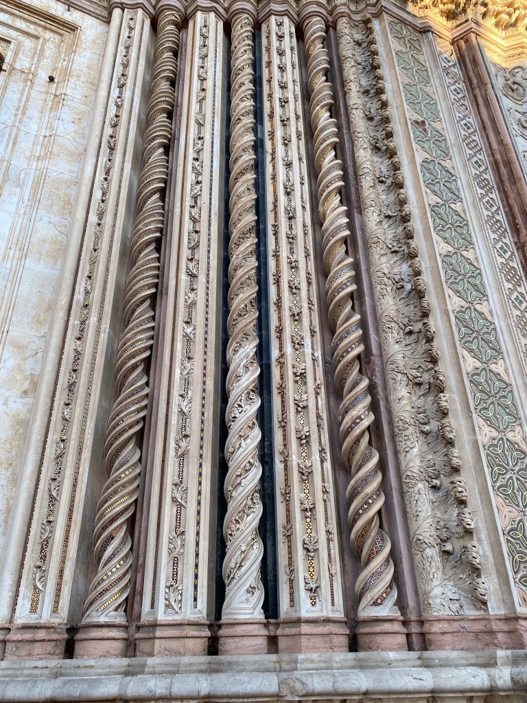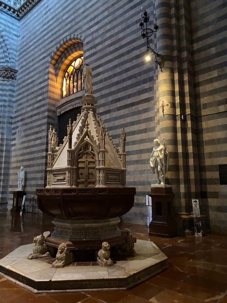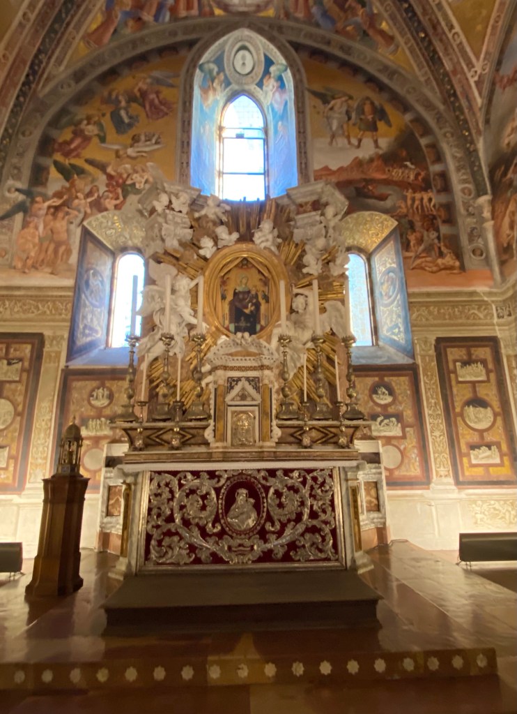 At the centre of the chapel is the Reliquary of the Santo Corporale in silver, gilded silver and varicoloured translucent enamel containing the bloodstained corporal. This Gothic masterpiece, in the form of a triptych, was made by Sienese goldsmith Ugolino di Vieri between 1337 and 1338. It shows 24 scenes of the life of Christ and eight stories about the corporal.