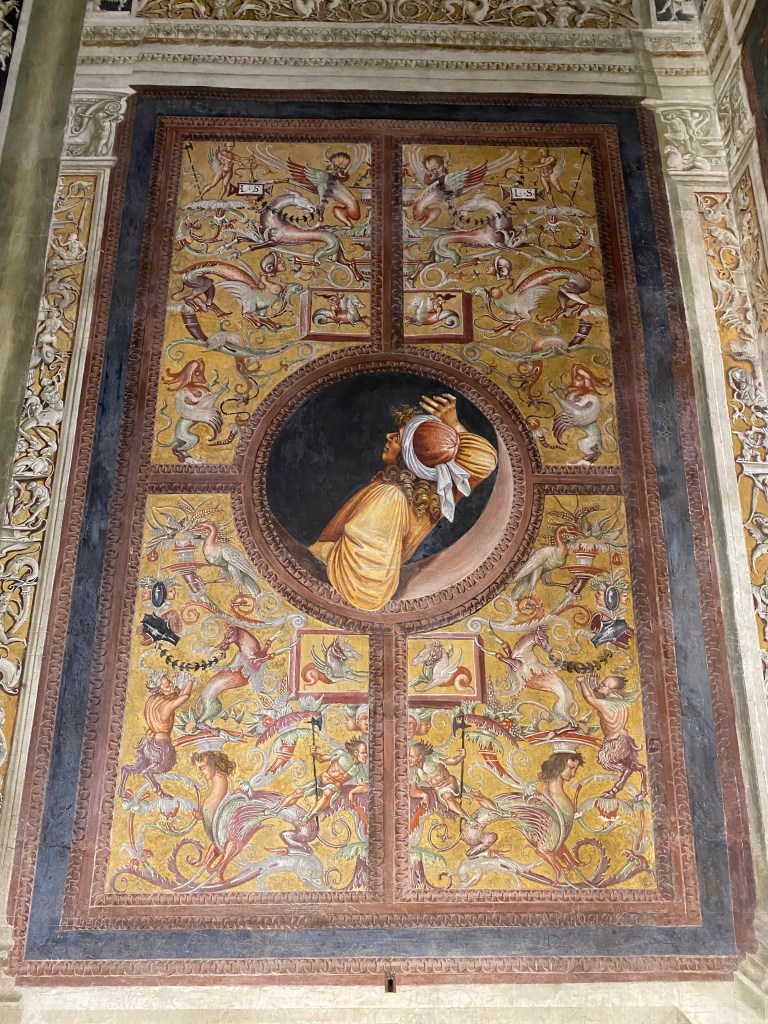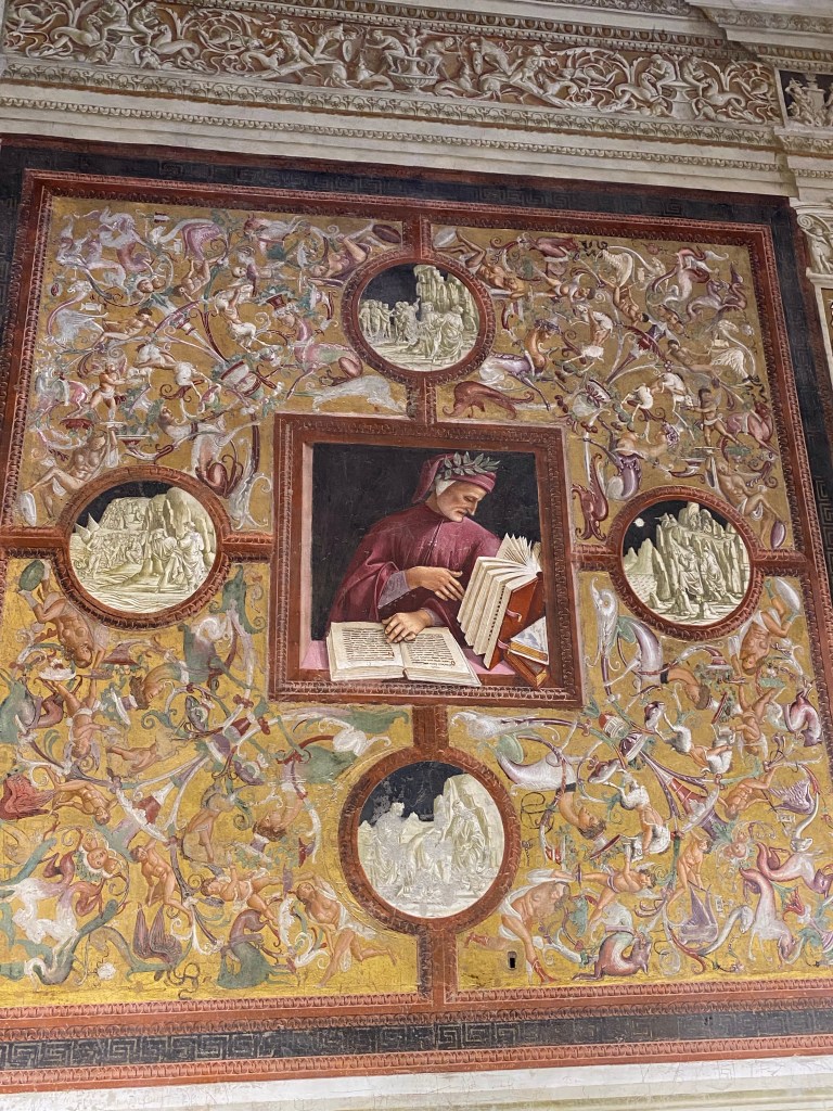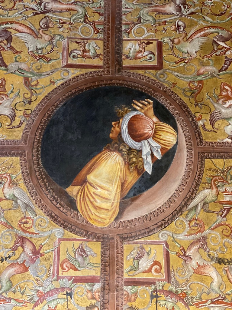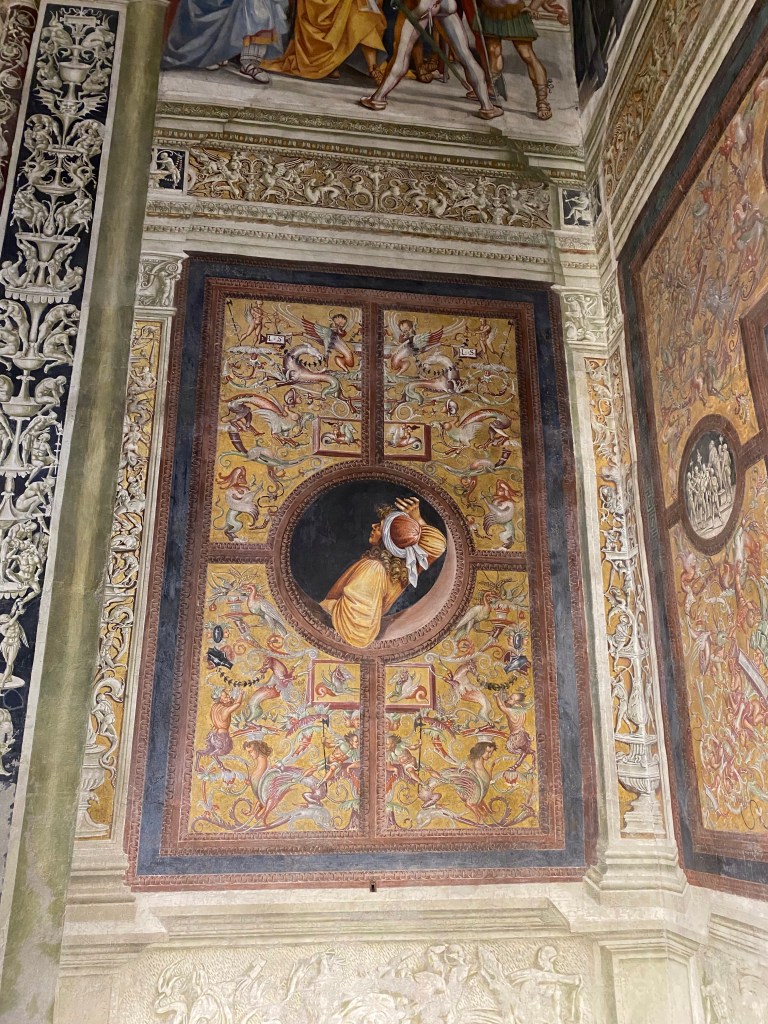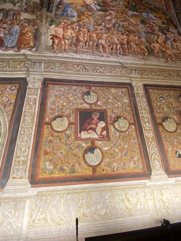 Below this are smaller paintings of famous writers and philosophers watching the unfolding disaster above them with interest. Legend states that the writers depicted here are Homer, Empedocles, Lucan, Horace, Ovid, Virgil and Dante, but the identifications are disputed by modern scholars. Several small-scale grisaille medallions depicting images from their works, including the first eleven books of Dante’s Purgatorio, Orpheus, Hercules, and various scenes from Ovid and Virgil, among others.