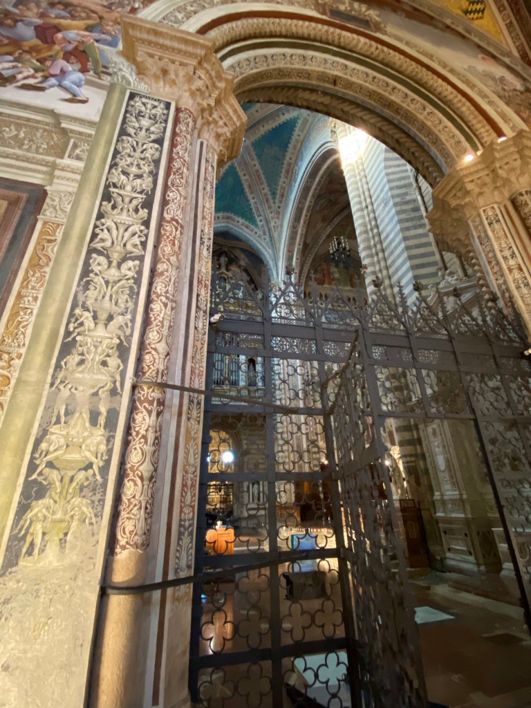 This chapel was a fifteenth-century addition to the cathedral. It is almost identical in structure to the Chapel of the Corporal. The construction of this chapel was started in 1408 and completed in 1444. It is closed off from the rest of the cathedral by two wrought iron gates. The first one closes off the right arm of the transept. It was signed by the Sienese master Conte di lello Orlandi (1337). The second gate stands at the entrance of the chapel and is of a much later date. It was signed by master Gismondo da Orvieto (1516).