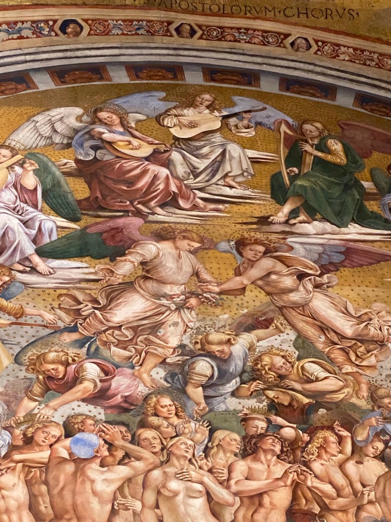 After being abandoned for about 50 years, the decoration of the rest of the vault was awarded to Luca Signorelli on 5 April 1499. He added the scenes with the Choir of the Apostles, of the Doctors, of the Martyrs, Virgins and Patriarchs.
