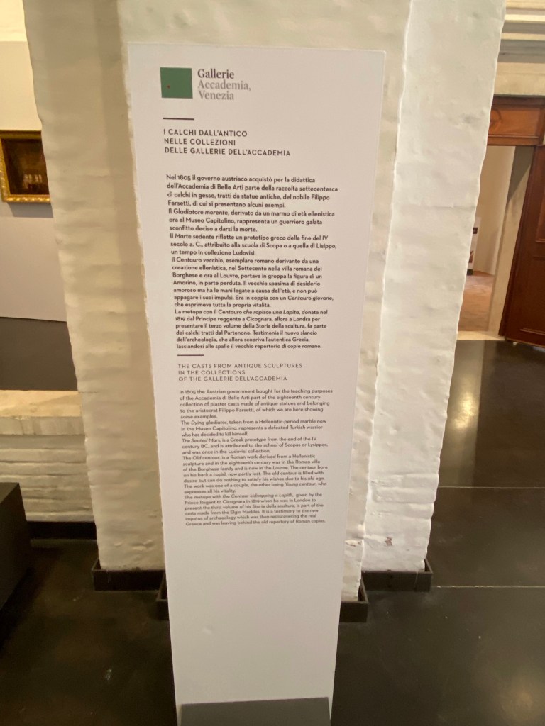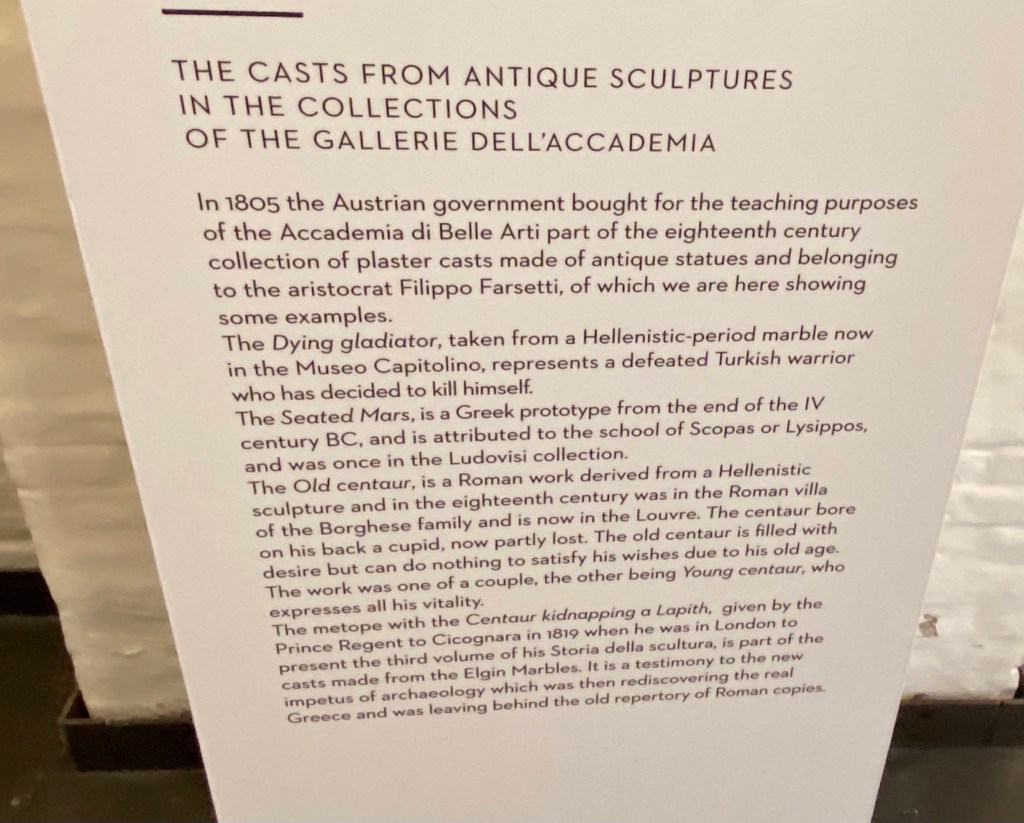 I’d been girding my loins in Venice, knowing full well I would be going to the Accademia and prepping myself for some serious looking and thinking. Admiring artworks is hard work, I don’t care what anybody says. Especially when you are a serious student. I was all set to start reading labels, performing quick formal analyses in my mind. And, when I saw a section at the beginning of the museum devoted to Canova casts, I headed right in! A bit of an appetizer before the main course.