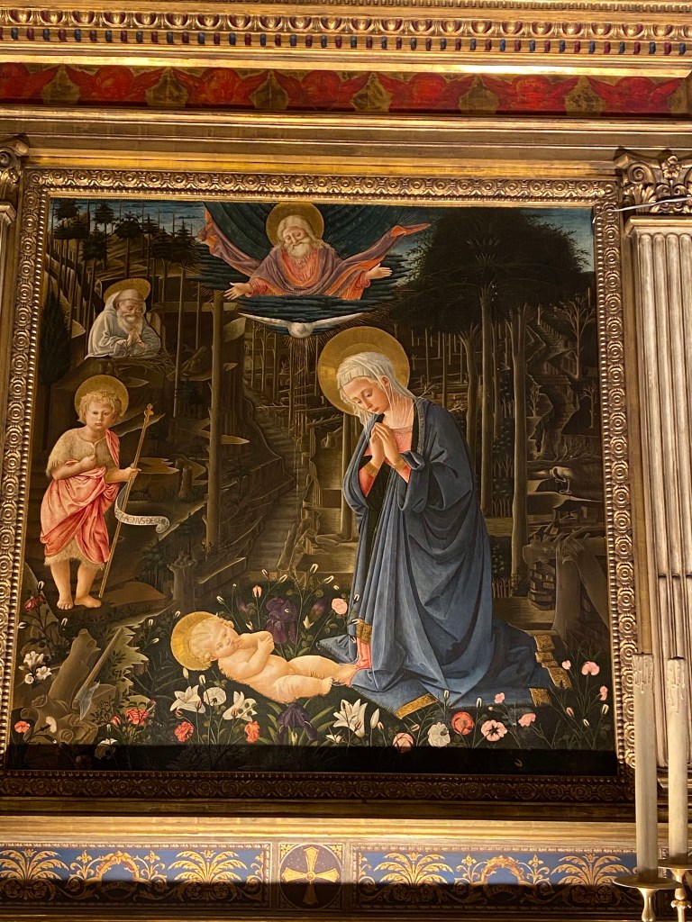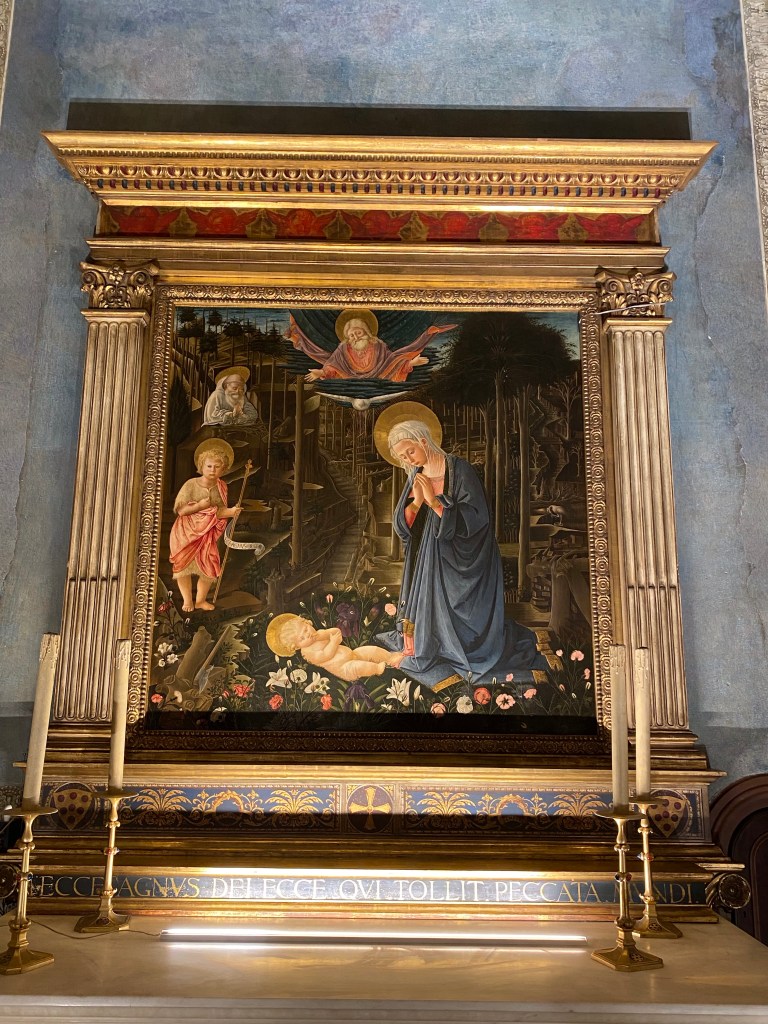 At the high altar, was the altar panel bearing Filippo Lippi’s Adoration in the Forest. This painting is now in Berlin after being sold in the 19th century, while a copy by a follower of Lippi remains in the chapel.