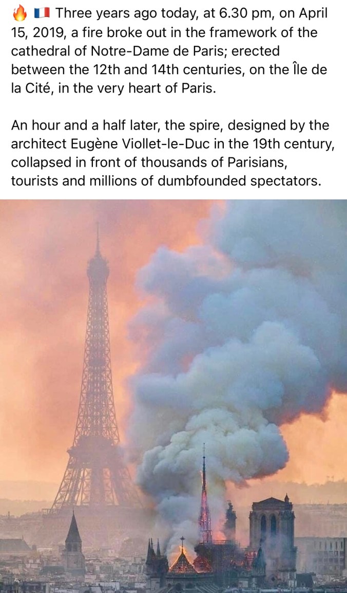 Notre Dame in flames April 2019 April 16, 2022 / get back, laurettadimmick Share this: Share on X (Opens in new window) X Share on Facebook (Opens in new window) Facebook More Share on Reddit (Opens in new window) Reddit Share on Tumblr (Opens in new window) Tumblr Share on Pinterest (Opens in new window) Pinterest Print (Opens in new window) Print Share on LinkedIn (Opens in new window) LinkedIn Email a link to a friend (Opens in new window) Email Like Loading...