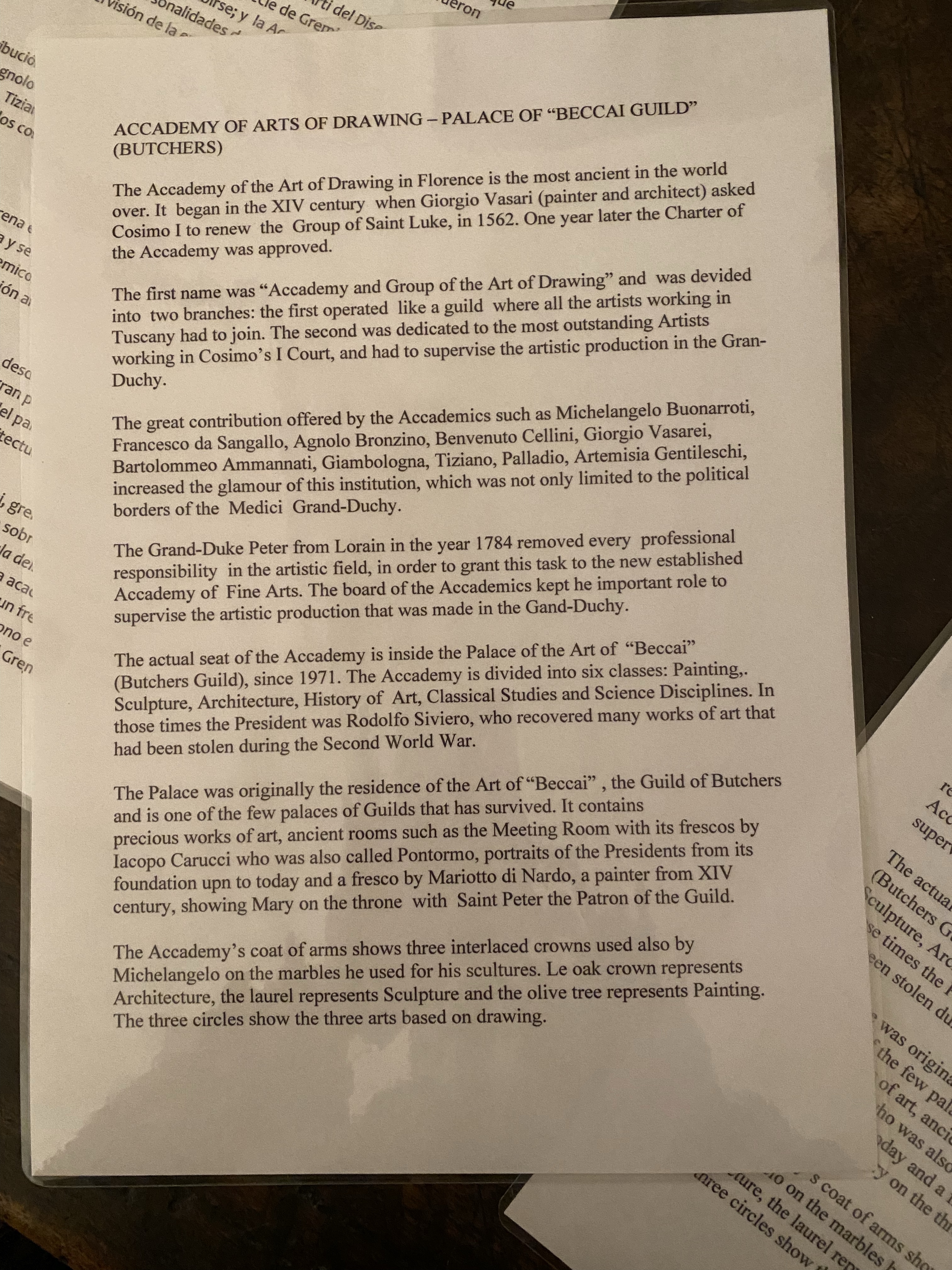 The academy is supposedly the oldest institution its kind. It was begun in the 16th century when Giorgio Vasari asked Duke Cosimo I to renew the Group of St. Luke. In 1564 the Charter for the academy was approved. The document below is provided to visitors by the docents of the association.