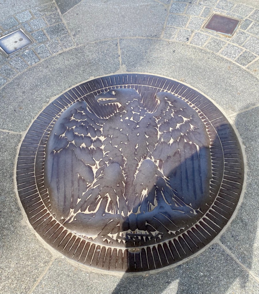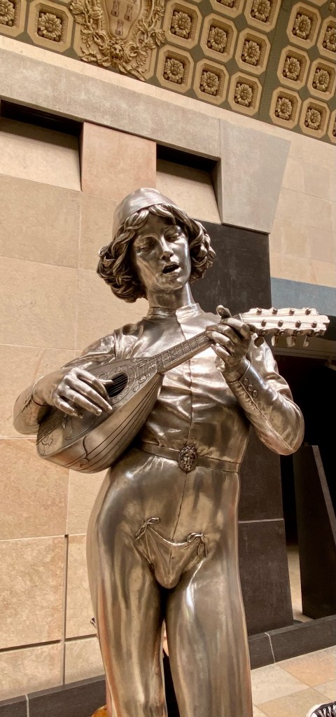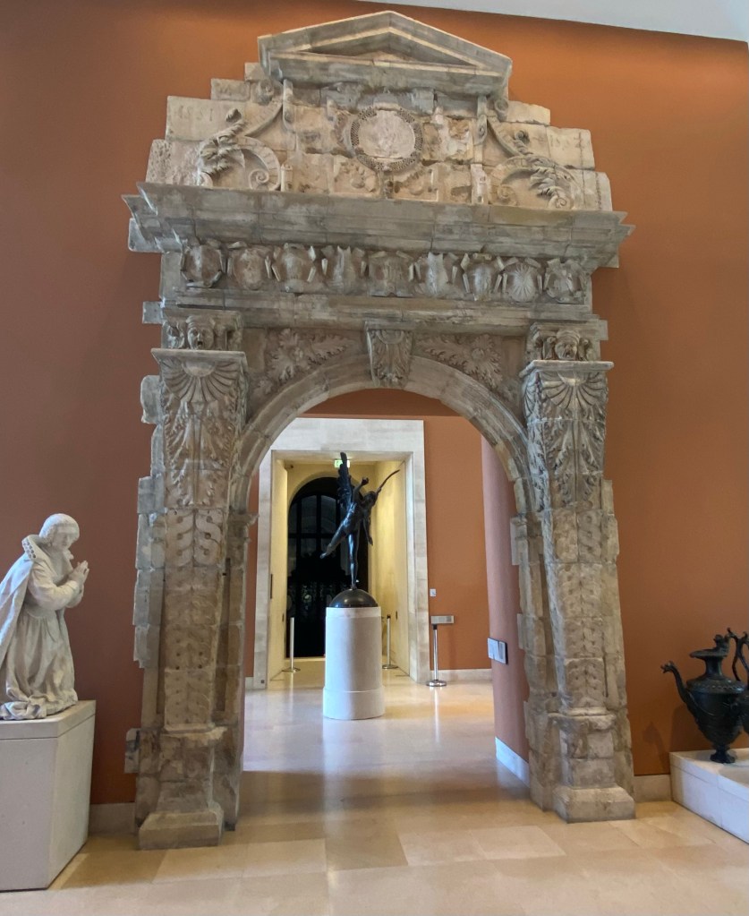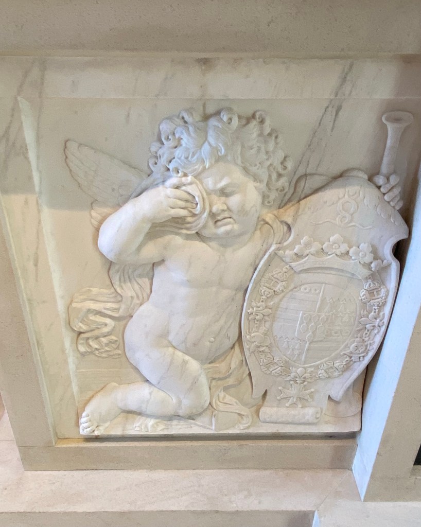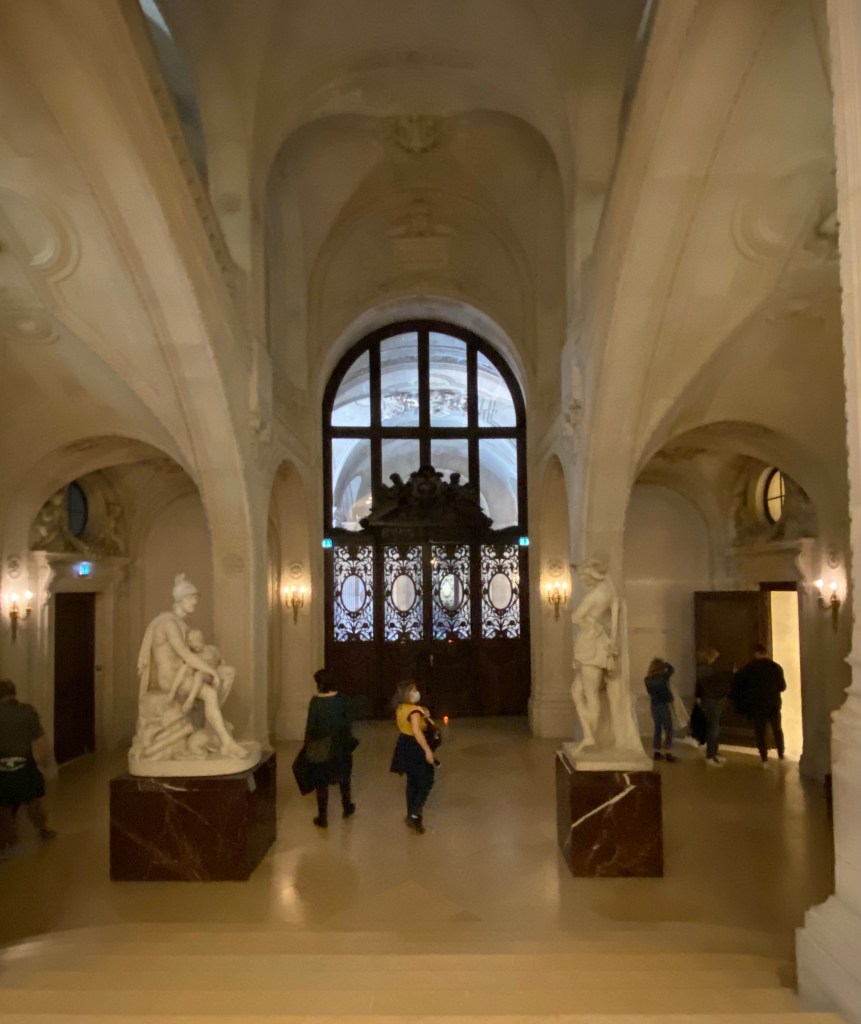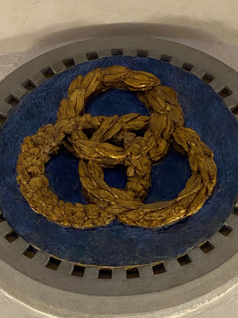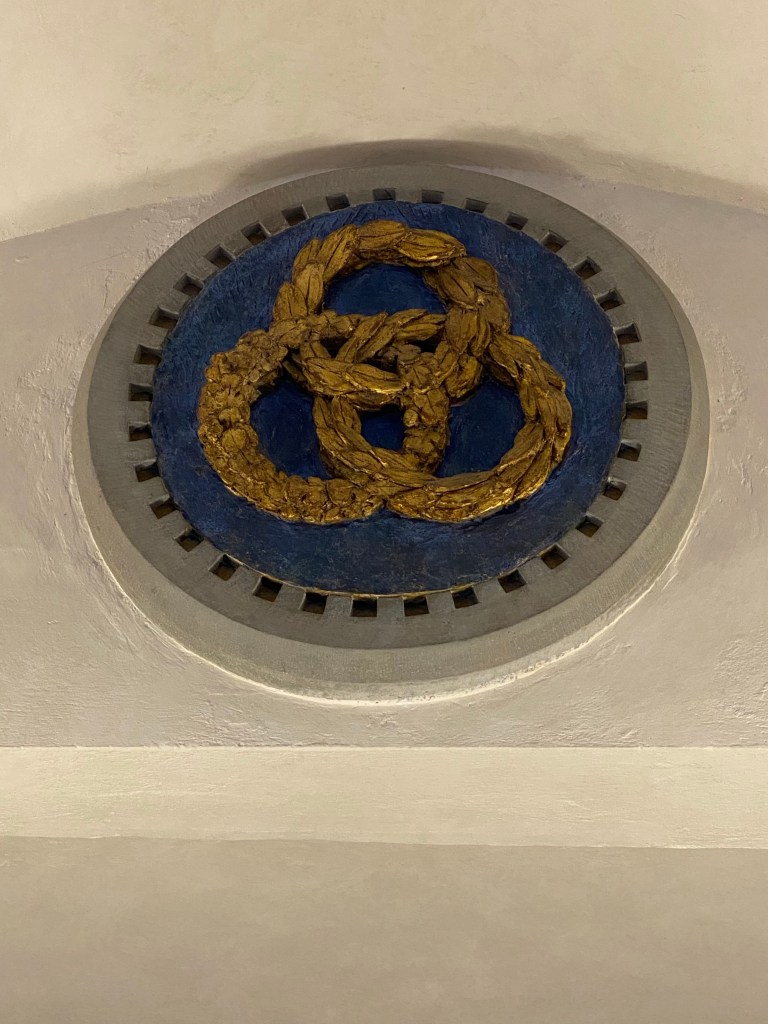 The 3 interlocking wreaths, which appear over the door to the associations main room, are the symbol of the academy and, as the brochure above explains, each of the wreaths is composed of a different plant leaf. The wreath of oak leaves symbolizes architecture; the laurel wreath represents sculpture; and the olive crown stands for painting.