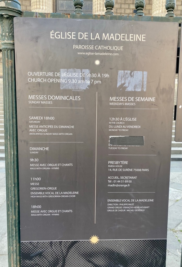 There’s a song I love called ‘Boulevard de la Madeleine’, but I didn’t know about the church. I enjoyed your pictures and description. It’s beautiful on the inside. I liked hearing the organ. What a huge sound.
