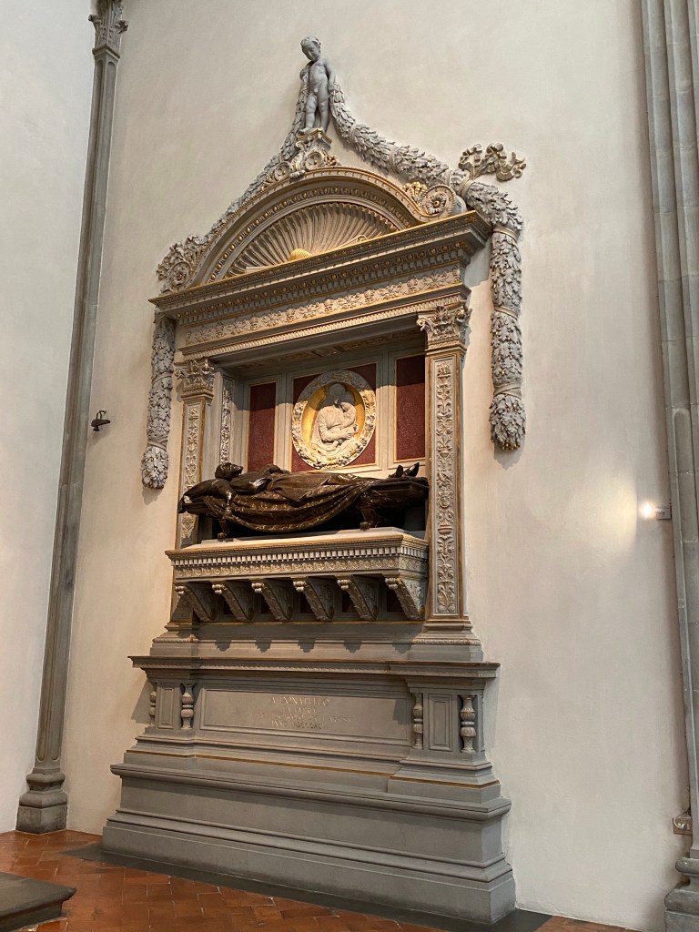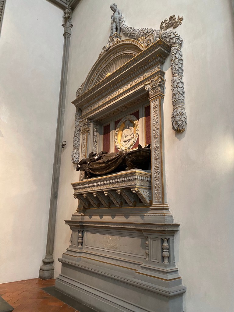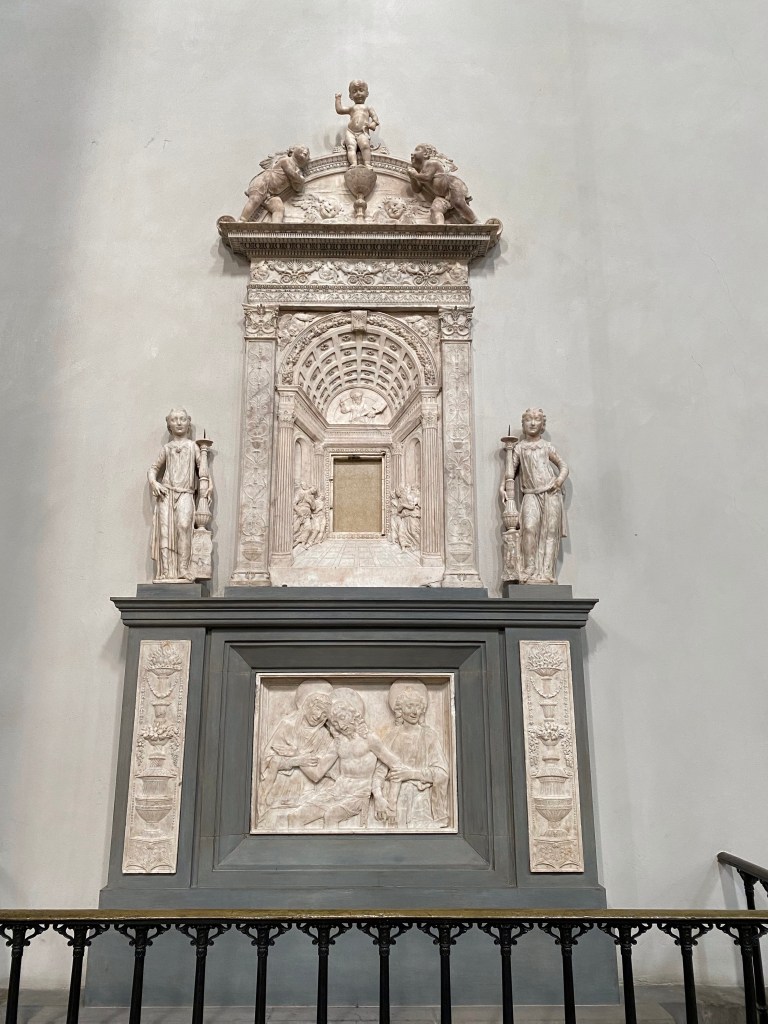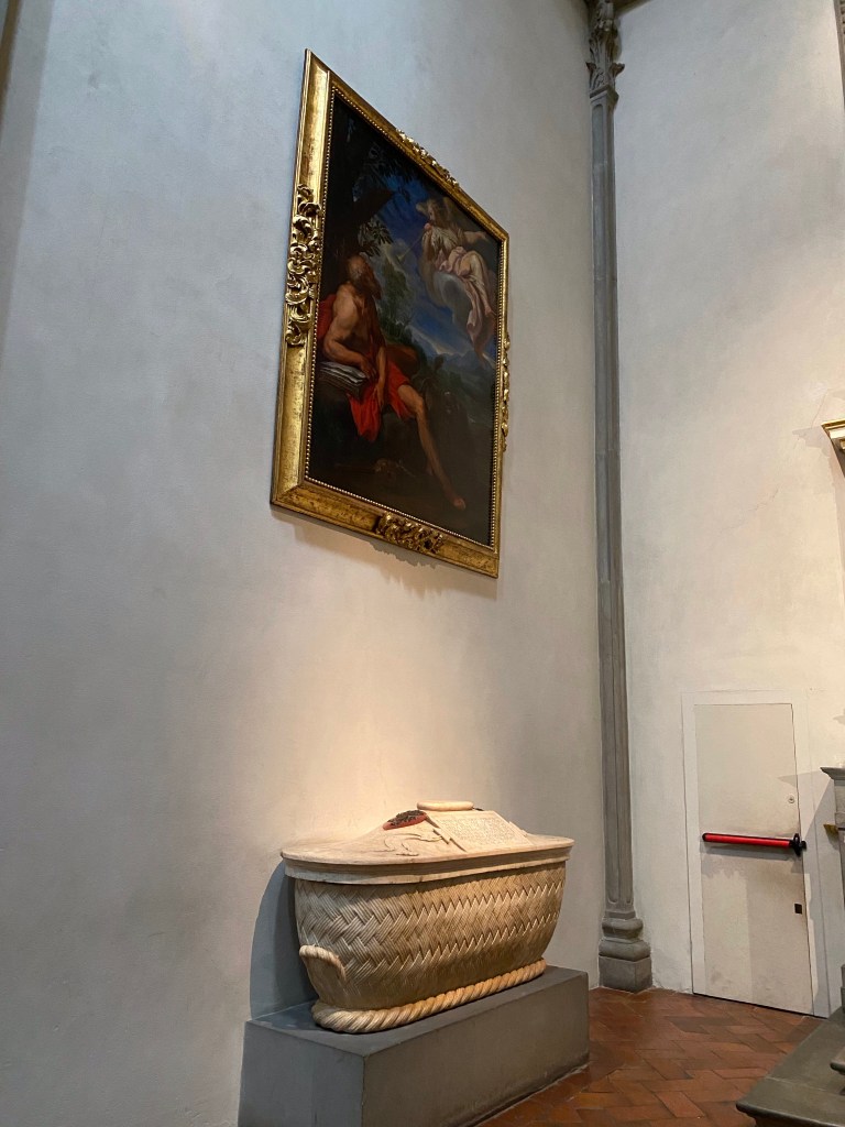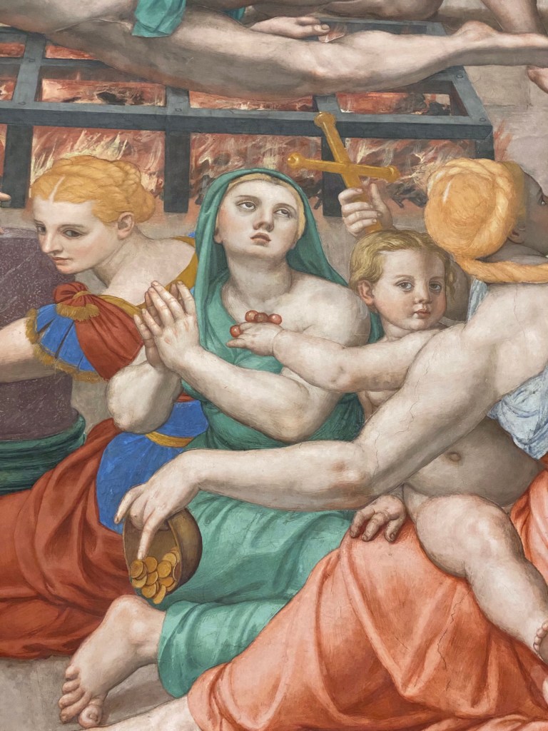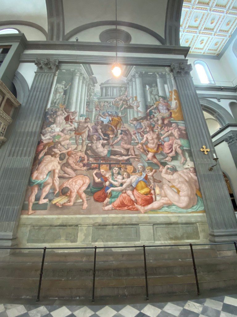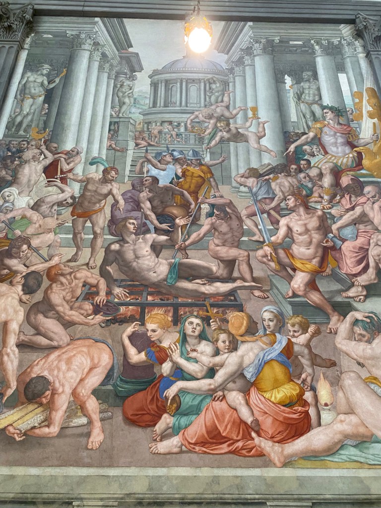 The large mannerist fresco of the Martyrdom of St Lawrence is by Bronzino. According to legend, St Lawrence, who was one of the deacons of Rome, was roasted alive on a gridiron in 258 AD.