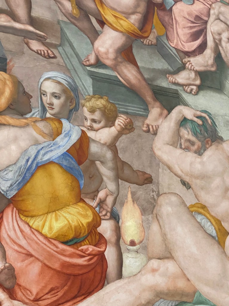 This is one of the last works of Bronzino. On the left of the fresco, beneath the statue of Mercury, Bronzino painted a self-portrait together with two portraits of his master, Pontormo, and his pupil, Alessandro Allori.