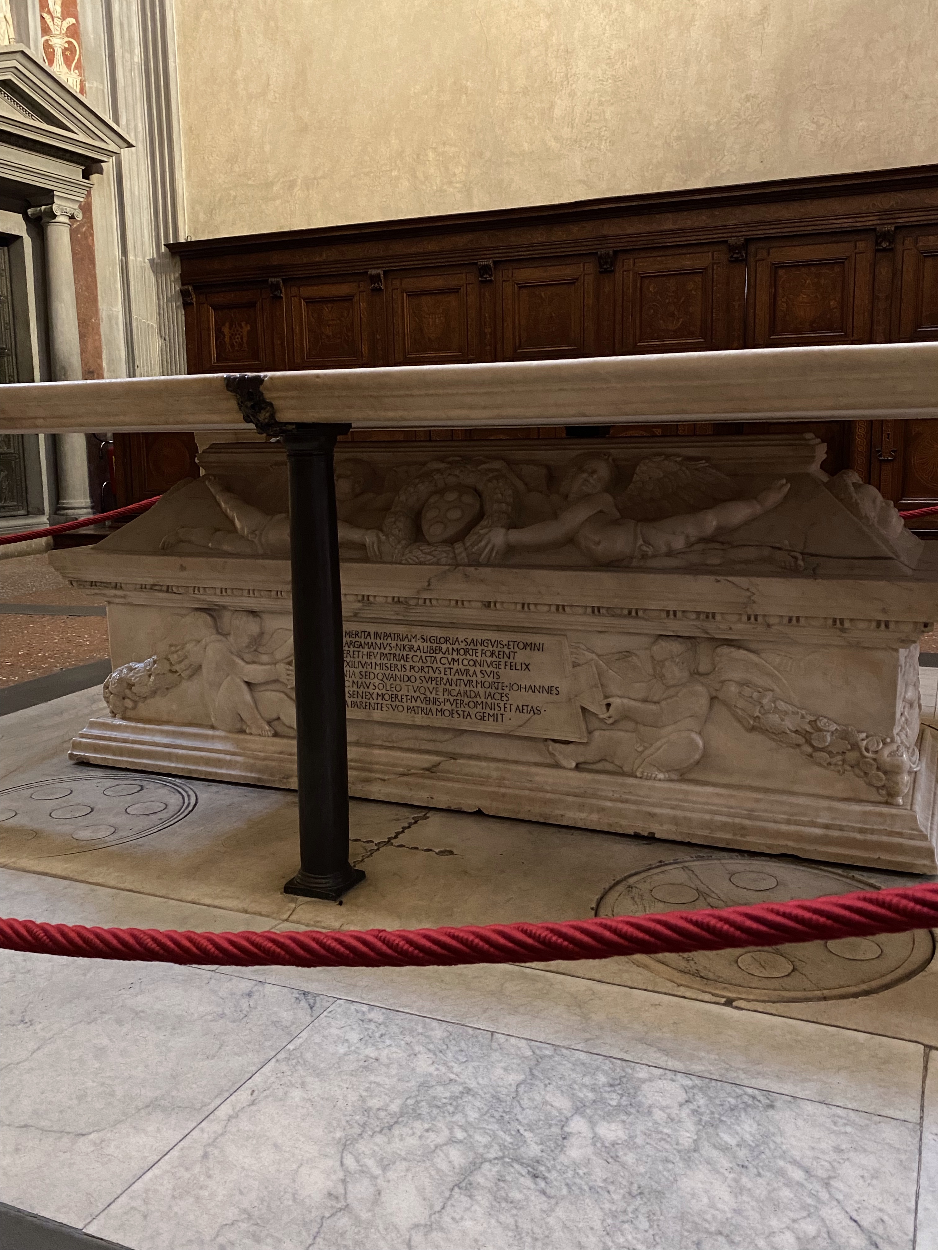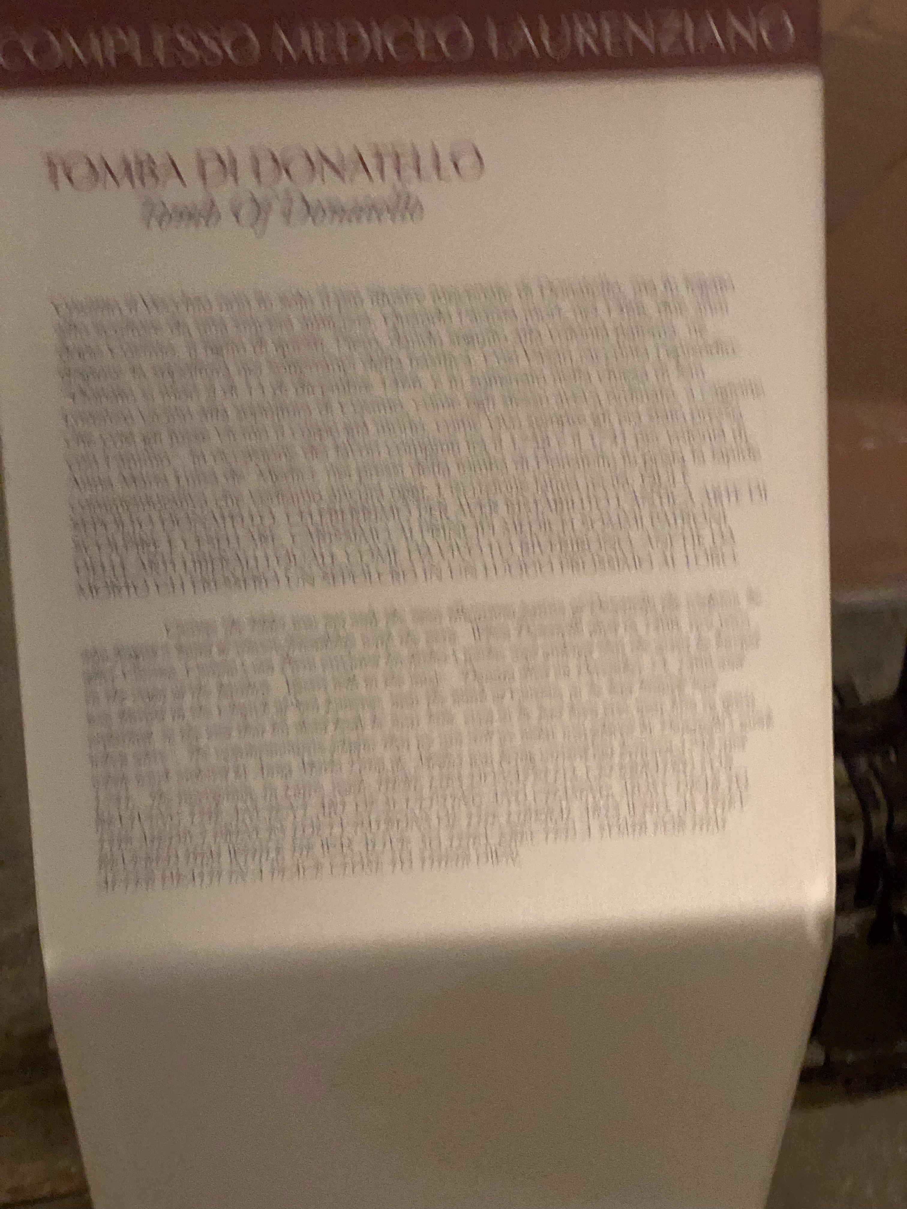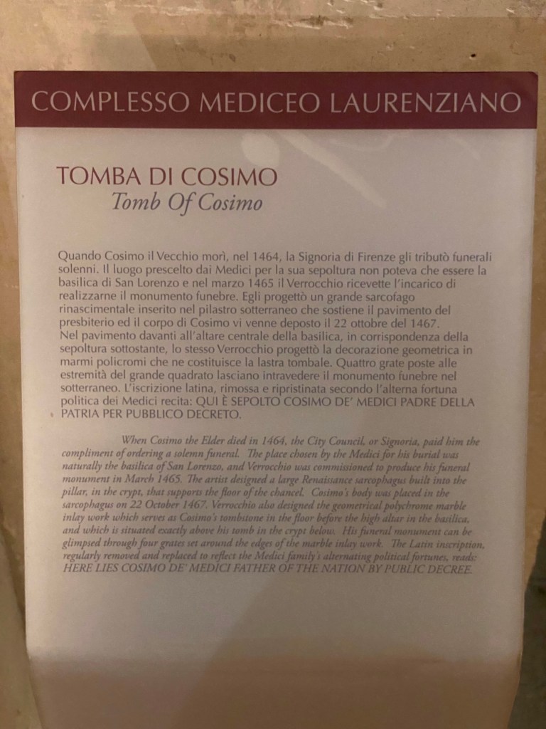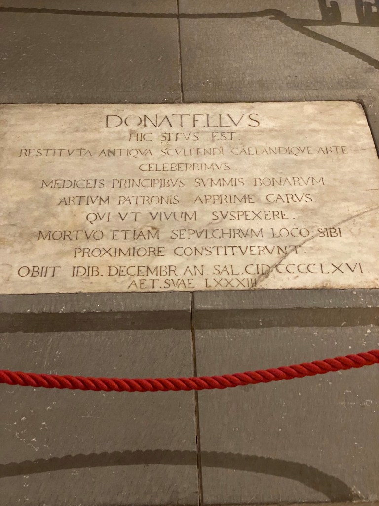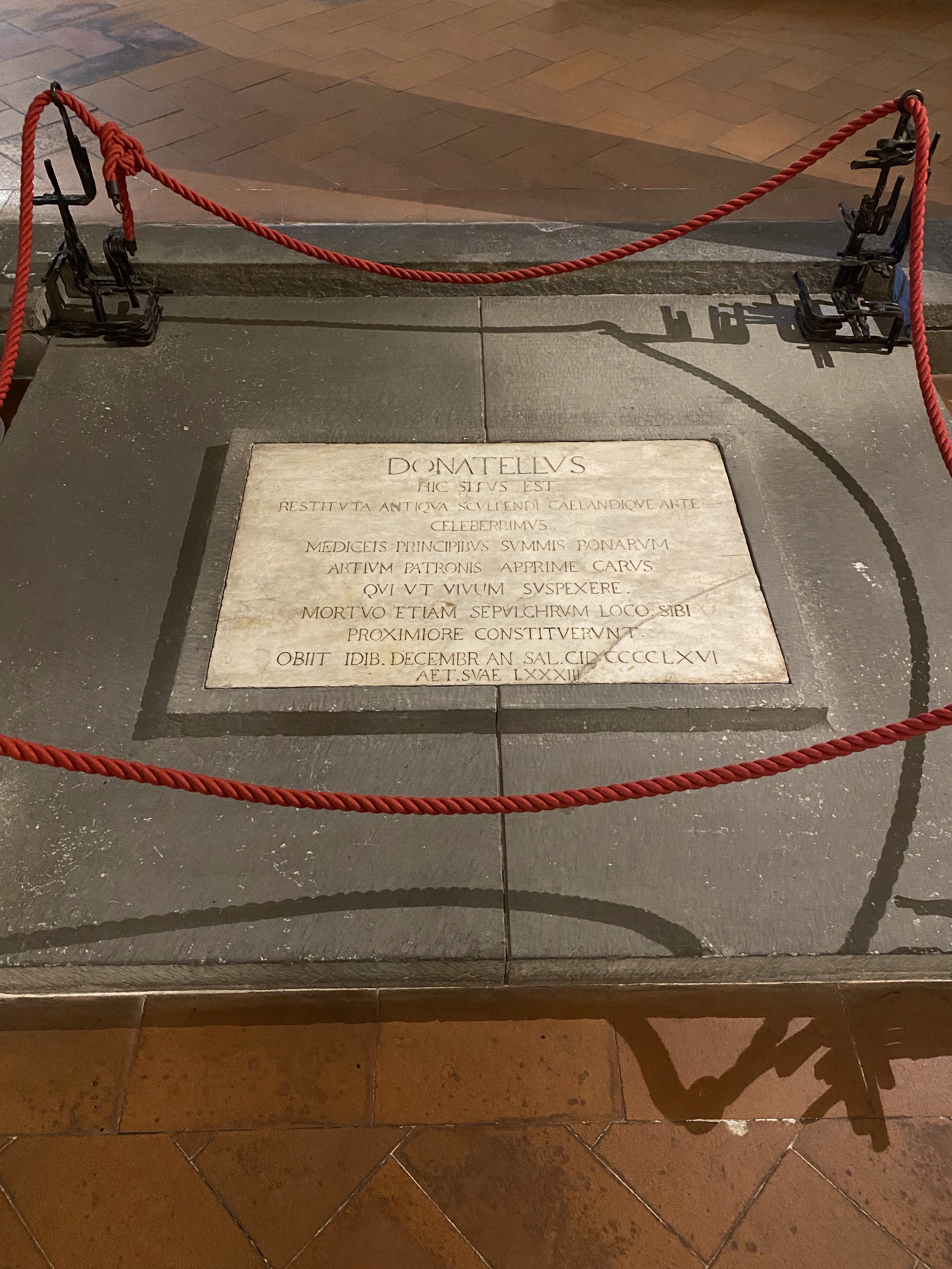 Today I am speaking of the tombs of Gianni di Bicci, Cosimo, Lorenzo the Magnificent and the family’s good friend, Renaissance sculptor Donatello. If you are interested in the ducal tombs in the 16th century chapel, this ain’t that.