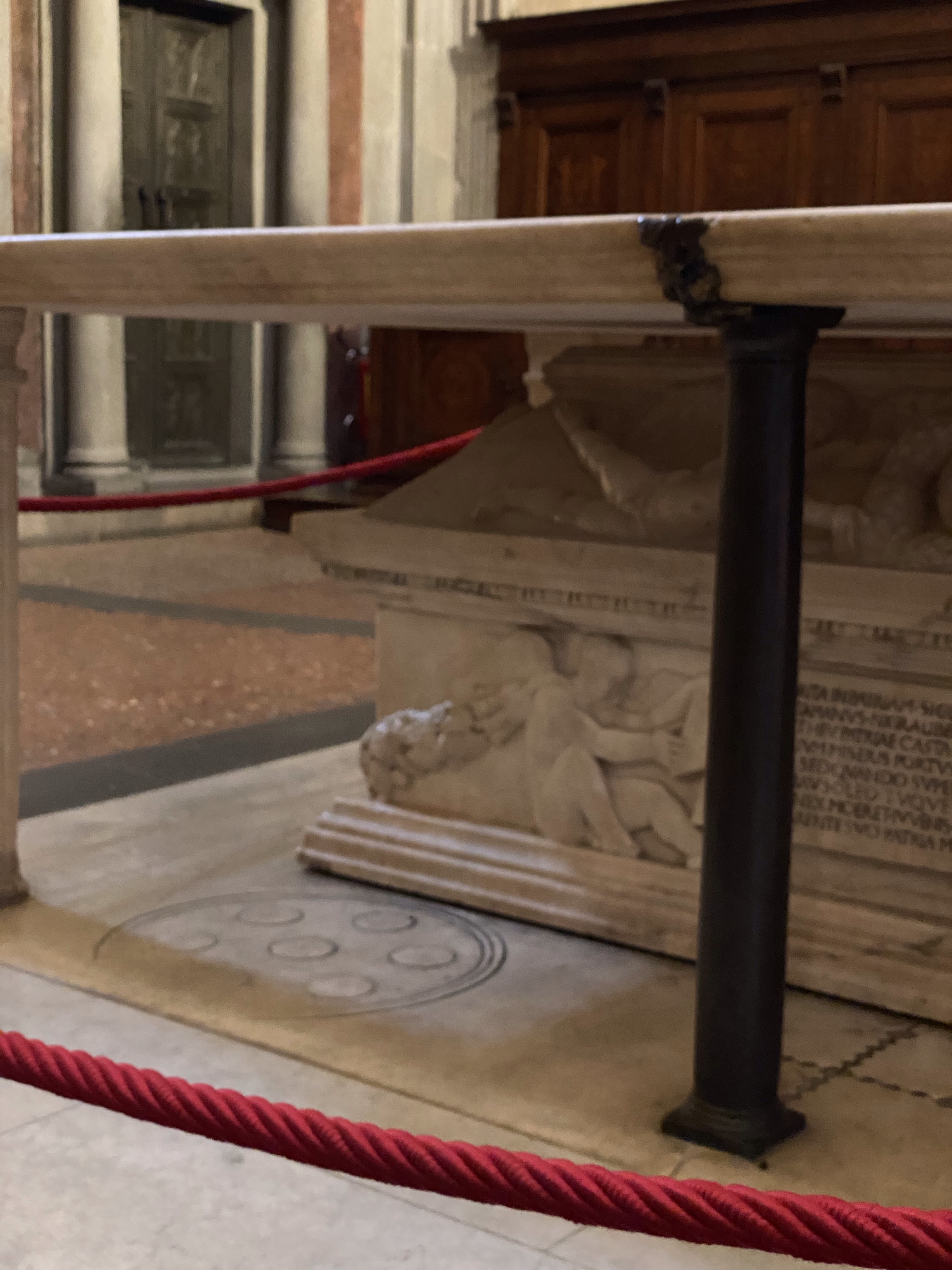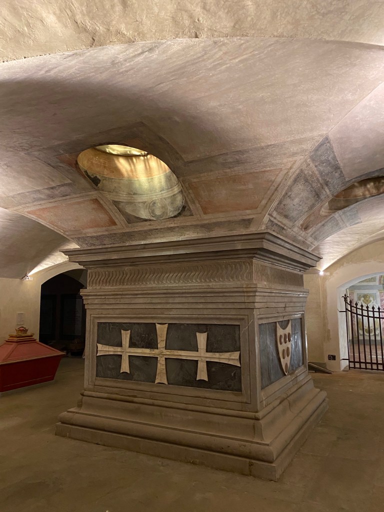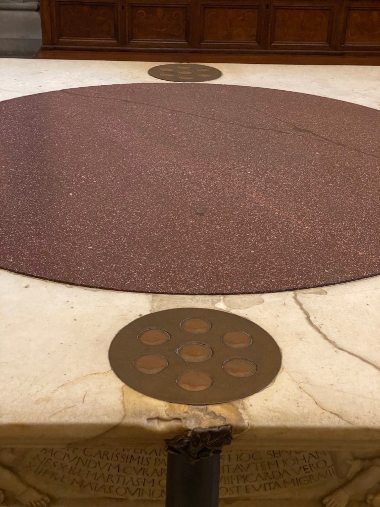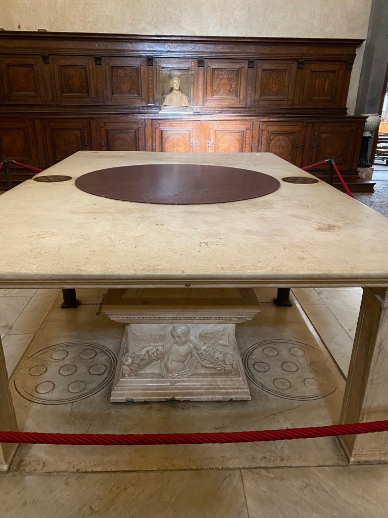 In addition to the underground tomb, the sculptor, Verrocchio, was also commissioned to create a cenotaph in the floor of the main basilica to commemorate Cosimo. This consists of an abstract patterned floor slab in front of the high altar connecting to a burial chamber in the crypt beneath. The artist used valuable materials—bronze, marble, red porphyry and green serpentine stones—to suggest Cosimo’s prestige. Interlocking ellipses within a circle and square evoke medieval diagrams of the universe, associating the name of Cosimo with the cosmos.