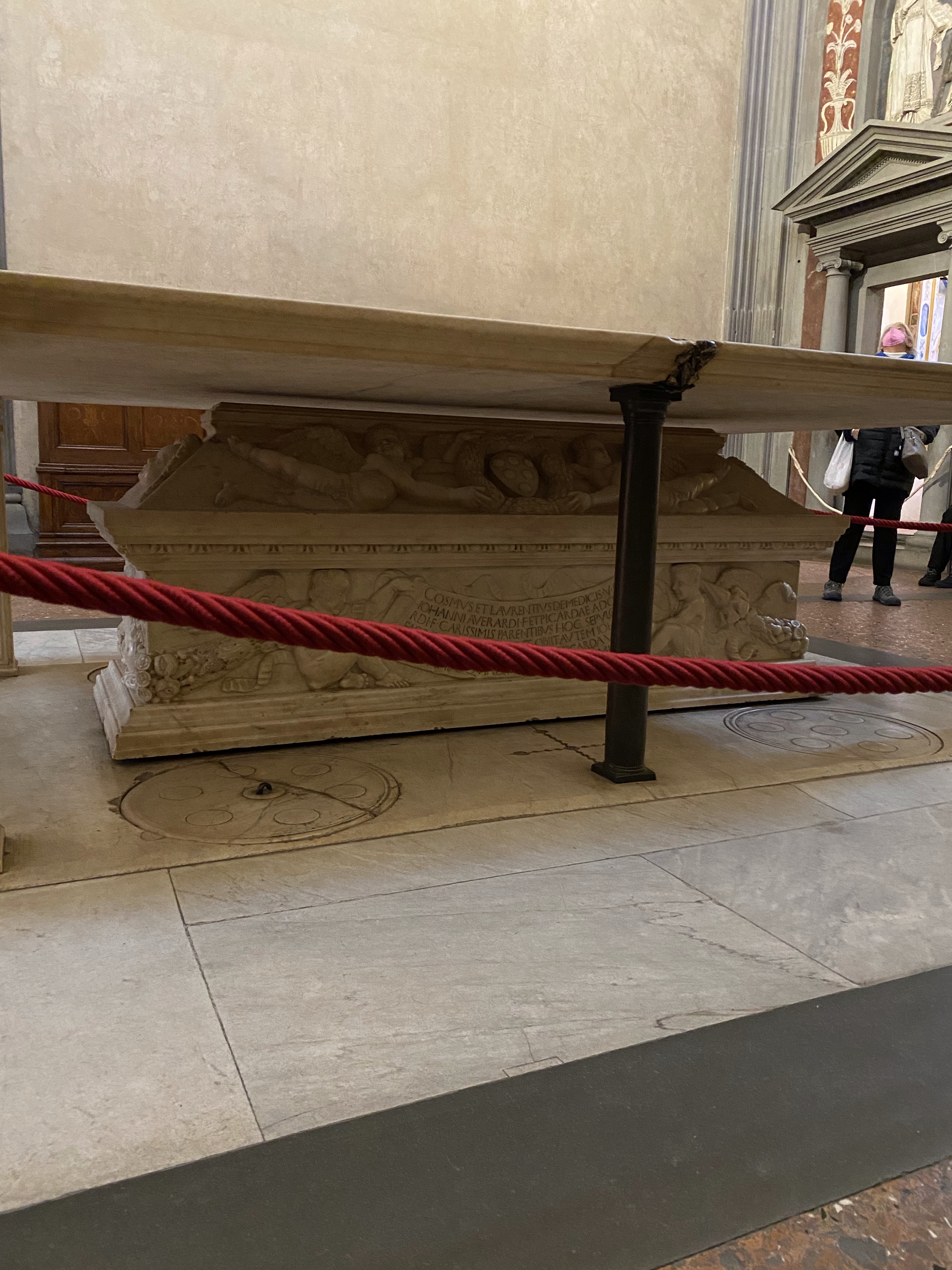 Giovanni di Bicci and his wife Piccarda were buried in the Old Sacristy, on a project designed by Brunelleschi. Their joint tomb is under what looks like a marble table in the Old Sacristy.