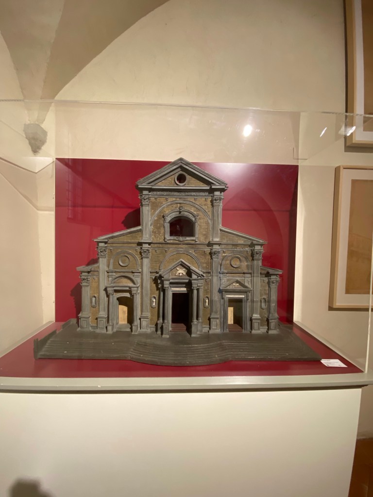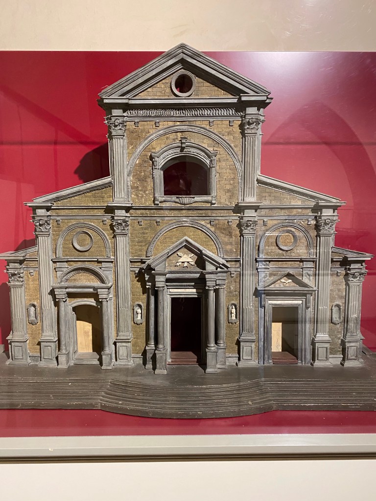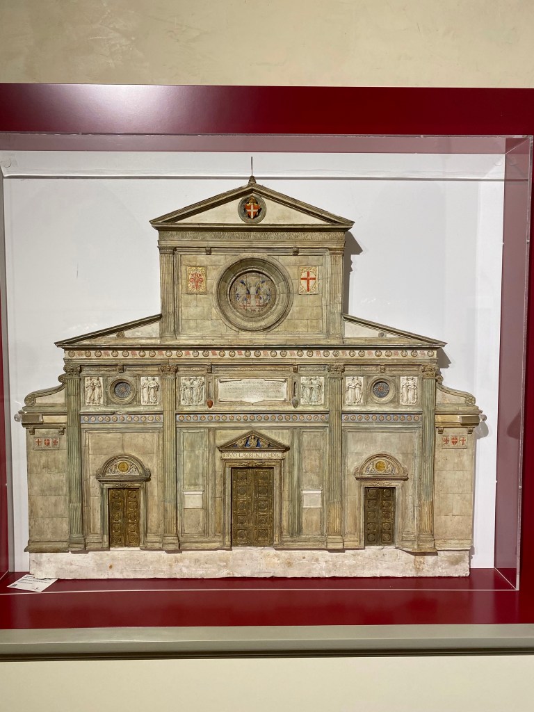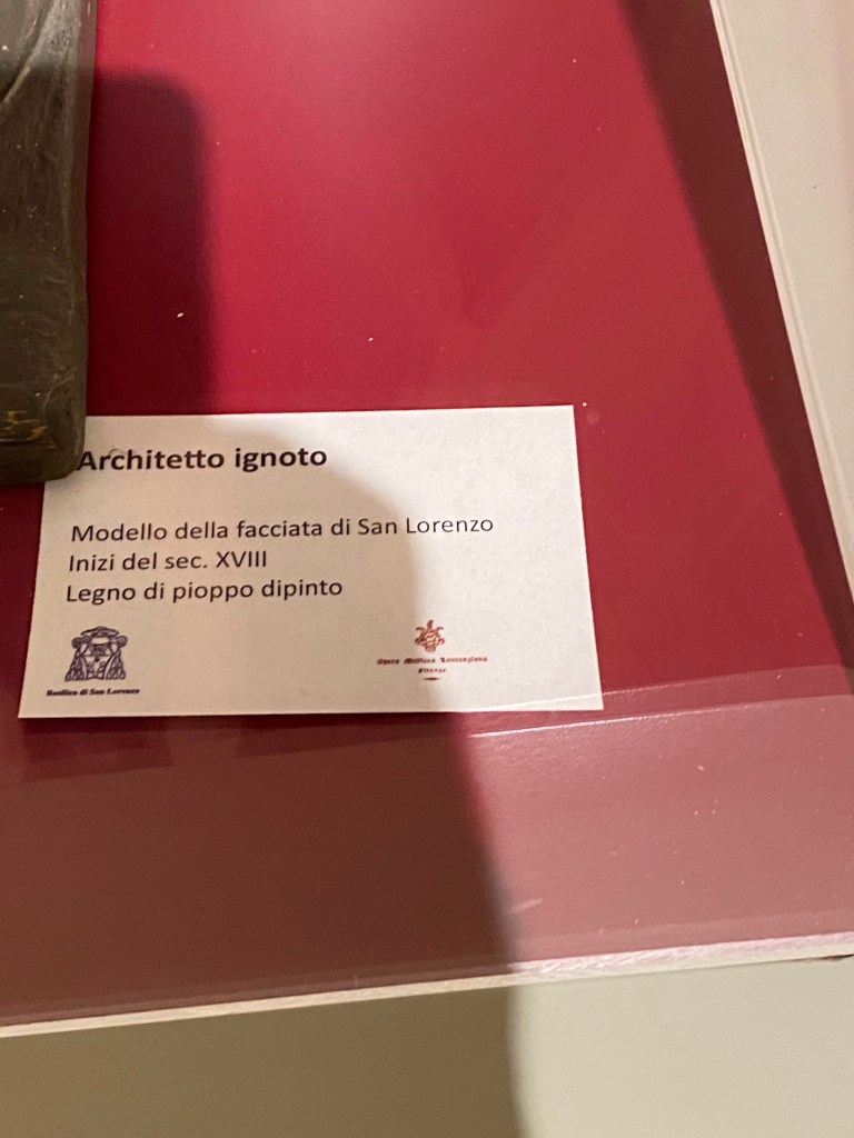 The Medici Pope Leo X gave Michelangelo the commission to design a façade in white Carrara marble in 1518. Michelangelo made a wooden model, which shows how he adjusted the classical proportions of the facade, drawn to scale, after the ideal proportions of the human body, to the greater height of the nave. The work remained unbuilt. Michelangelo did, however, design and build the internal facade, seen from the nave looking back toward the entrances. It comprises three doors between two pilasters with garlands of oak and laurel and a balcony on two Corinthian columns.