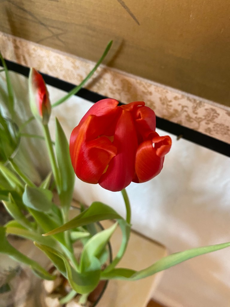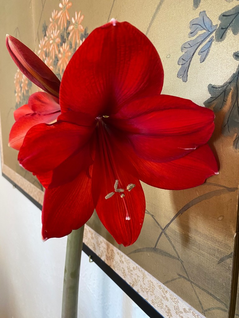Amaryllis blooming from forced bulbs. I started them around December 1 and am enjoying their joyful blooms now. They remind me of flamenco dancers in their crimson glory!
