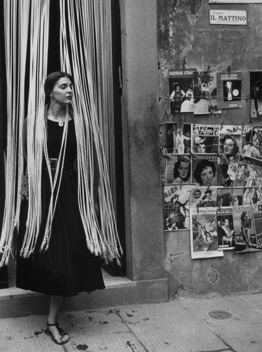 When I first visited Florence in the late 1970s, the beaded curtains still served as “screens” keeping flies and sunlight out of store interiors. The same as above, the shot taken in 1952. You don’t find that anymore.