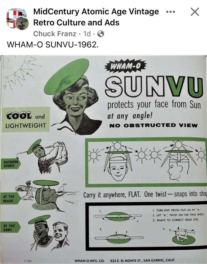 The wham-o sunvu from 1962. I was there then and I don’t remember seeing anyone using this contraption. But, as I am an avowed sun avoider nowadays, I wonder…did this weird thing work?!!