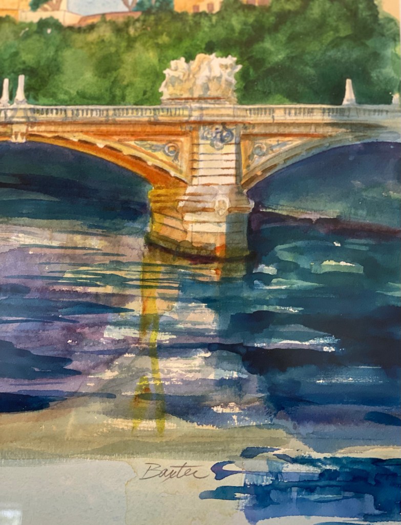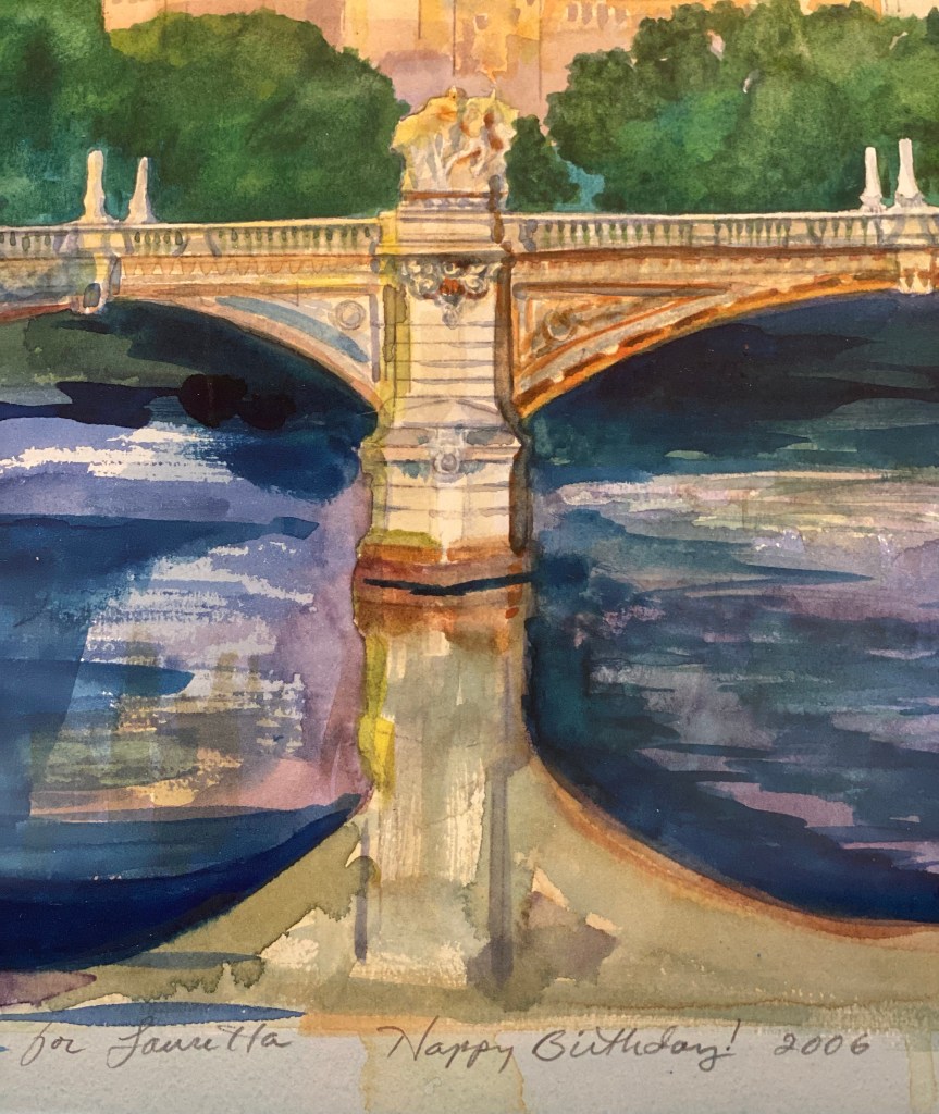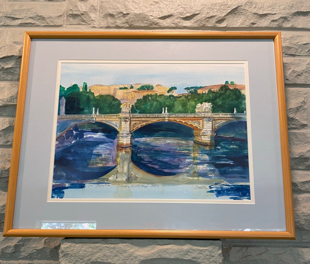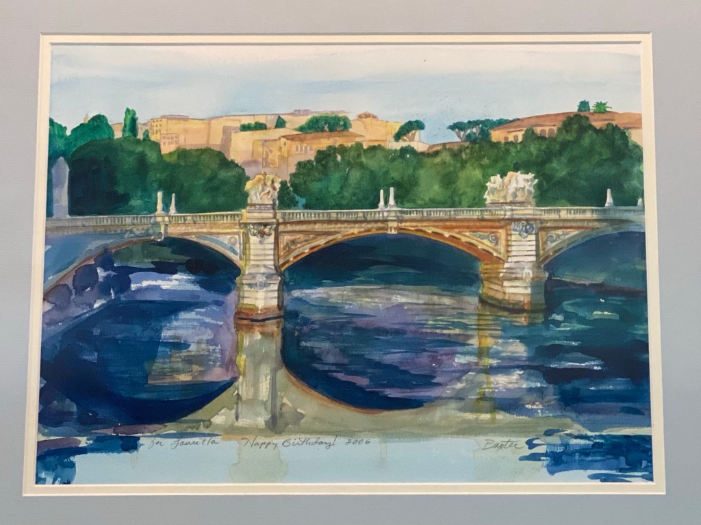 Karen waited her whole life to make a trip to Italy, which she did with her family after her son was born in 1993. She took myriad pictures and this bridge in Rome became the subject of one of her amazing watercolors.