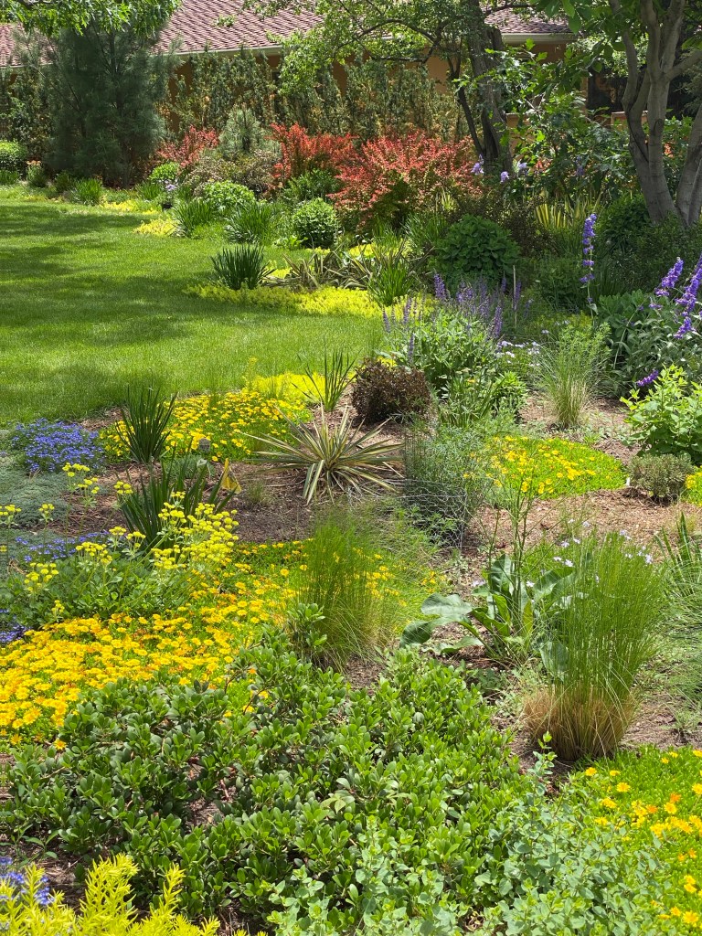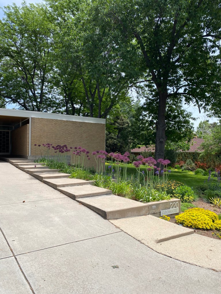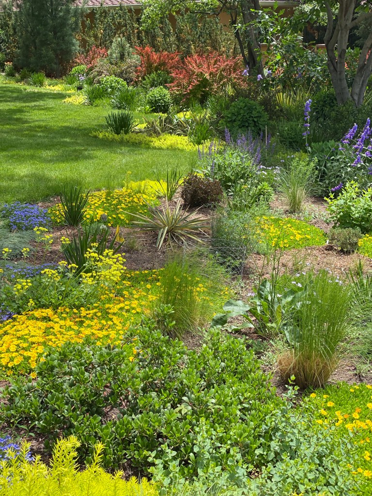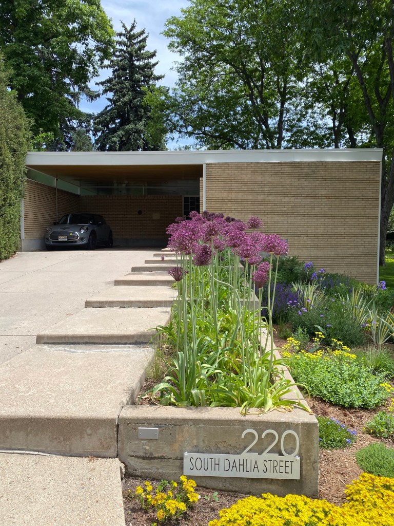 There’s a really attractive mid-century home in my neighborhood and it has one of the best designed gardens I’ve seen here. Deep greens and blues, with purples and yellow. All grouped in a striking design.