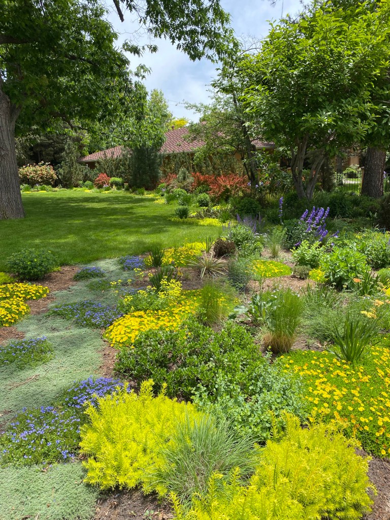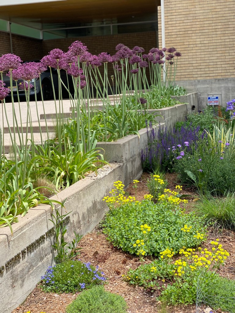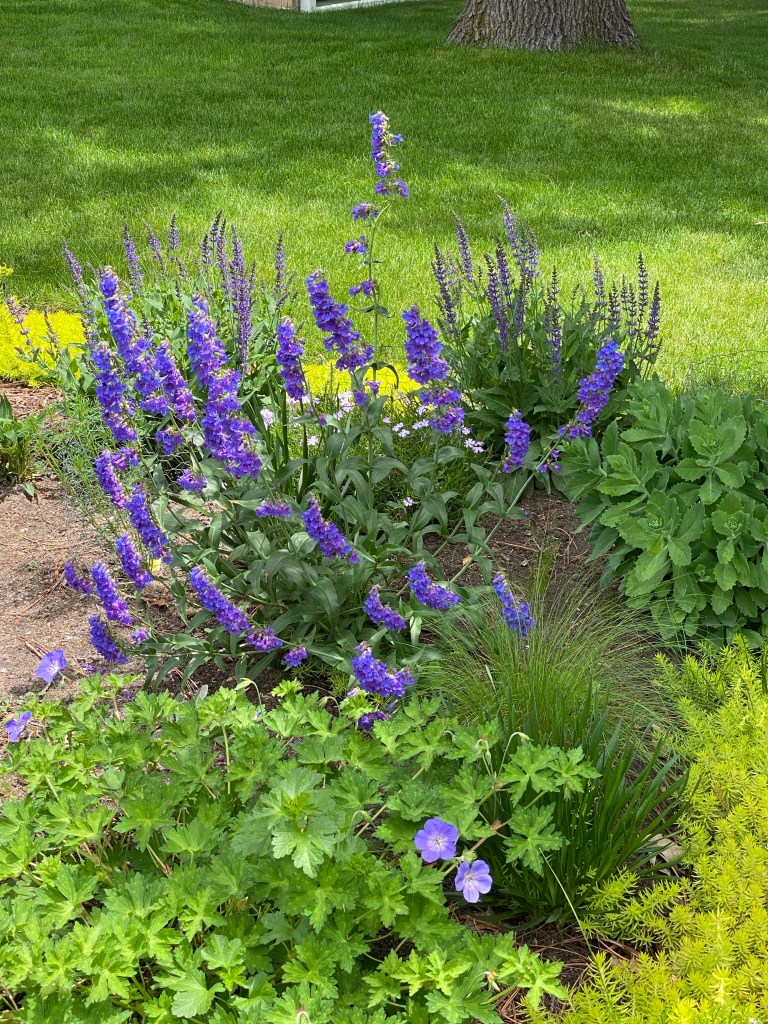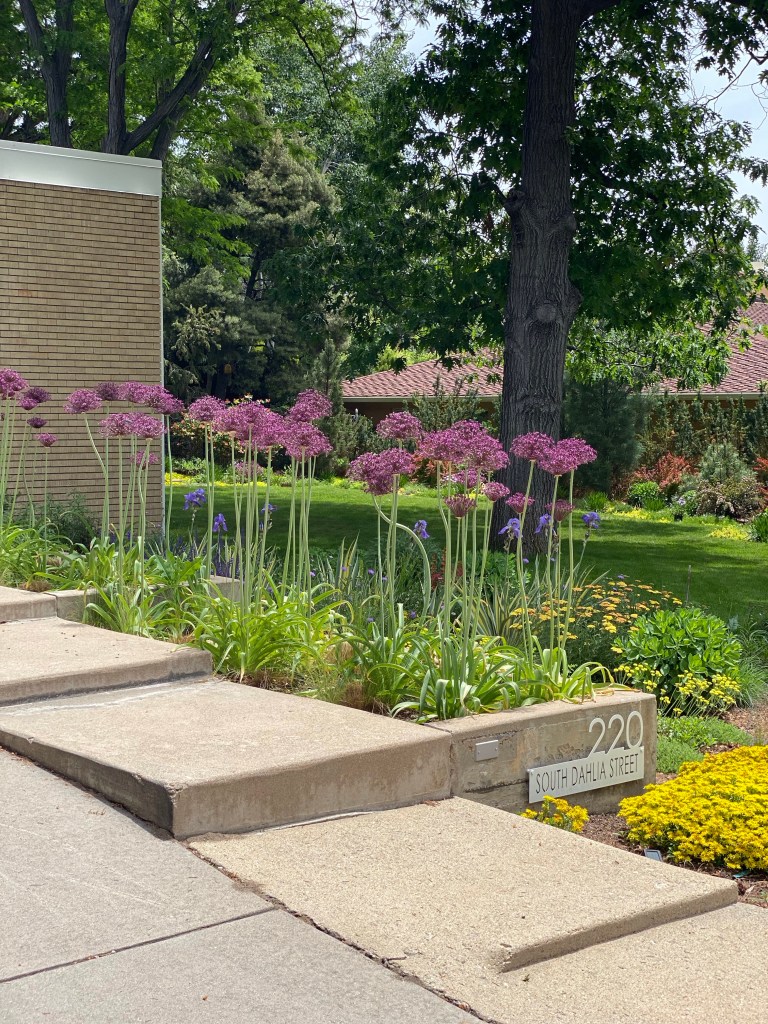 There’s a really attractive mid-century home in my neighborhood and it has one of the best designed gardens I’ve seen here. Deep greens and blues, with purples and yellow. All grouped in a striking design.