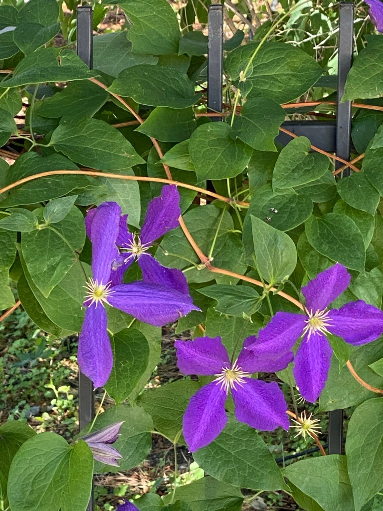 Clematis in full glory. This beautiful vine is growing in a shady location in a neighbor’s garden. The incredible blossoms are 5 inches across.