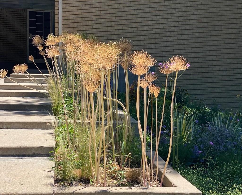 The thing is, even after the purple blossoms have faded, this particular set of alliums leave a striking stem and dried blossom skeleton.