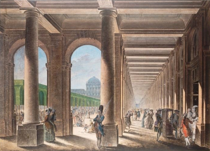 The six-storey buildings that surround the gardens on three sides have galleries on the ground floor containing shops and restaurants The garden galleries were constructed 1781–1784 to the designs of the Victor Louis. On the west side is the Montpensier Gallery, on the north, the Beaujolais Gallery, and to the east, the Valois Gallery. Traversing the south side of the garden are two parallel colonnades, remnants of the former covered Galerie d’Orléans (demolished in 1930). They stand between the Court of Honor and the garden.