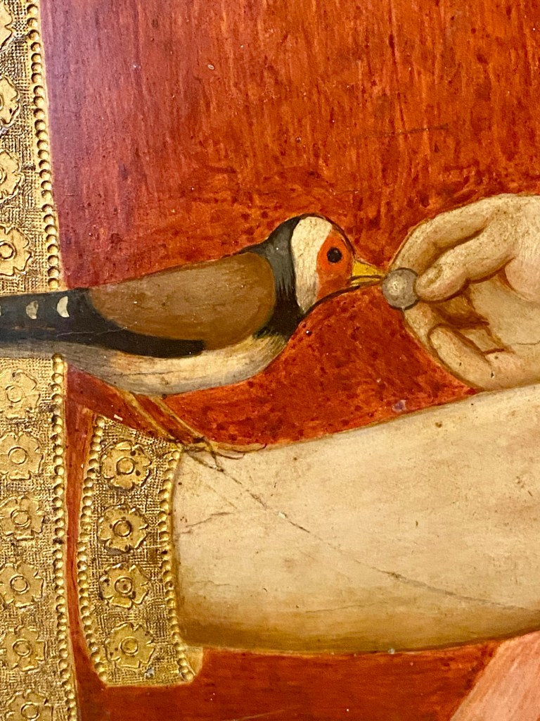 Now a detail of the copy. The thing that caught my eye is that the bird in this work is held by a string tied around its neck. I didn’t see that in the original, so I went back and had a look. The paint is effaced on the earlier work except for the areas at either end of the string. If you go back and look at the details, you’ll see what I mean.