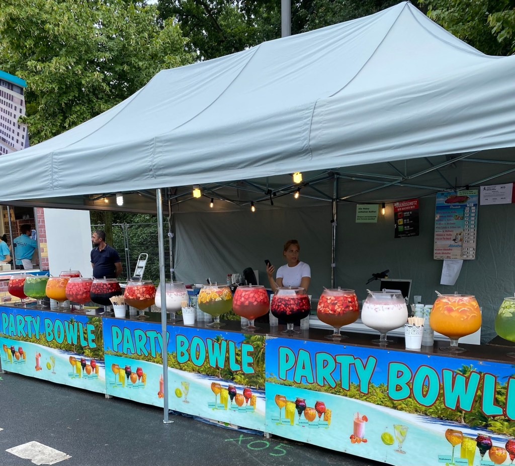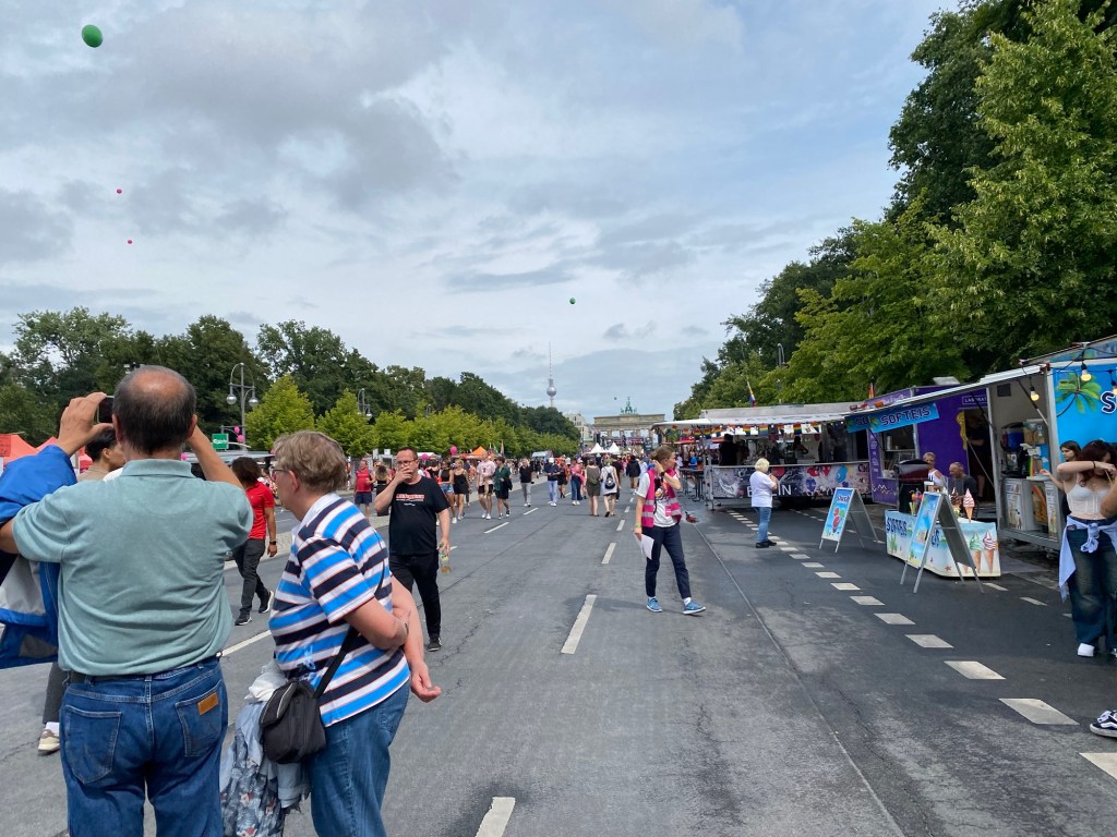 I don’t know if it’s like this every weekend, but there was a huge afternoon party today in the Tiergarten, on the section that begins with the Victory Column and ended at the Brandenburg Gate. Everybody and their brother and sister were there this afternoon and the music was blaring, the alcohol was flowing, and the crowds were huge but not unruly. There were thousands (it seemed) of portable toilets and 80% of the people at least were dressed if not in costumes, then in a weird and wacky way. Glitter abounded. It was definitely geared towards gay pride, but there were lots of themes going on, it seemed to me.