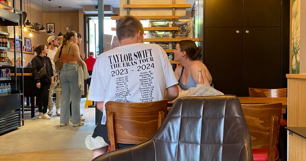 After walking all this way and dodging crazy crowds, I needed to rest at a cafe and there, right in front of me, was a reminder that everything is global. This guy had on a current Taylor Swift t-shirt and I have no doubt he attended one of the shows.