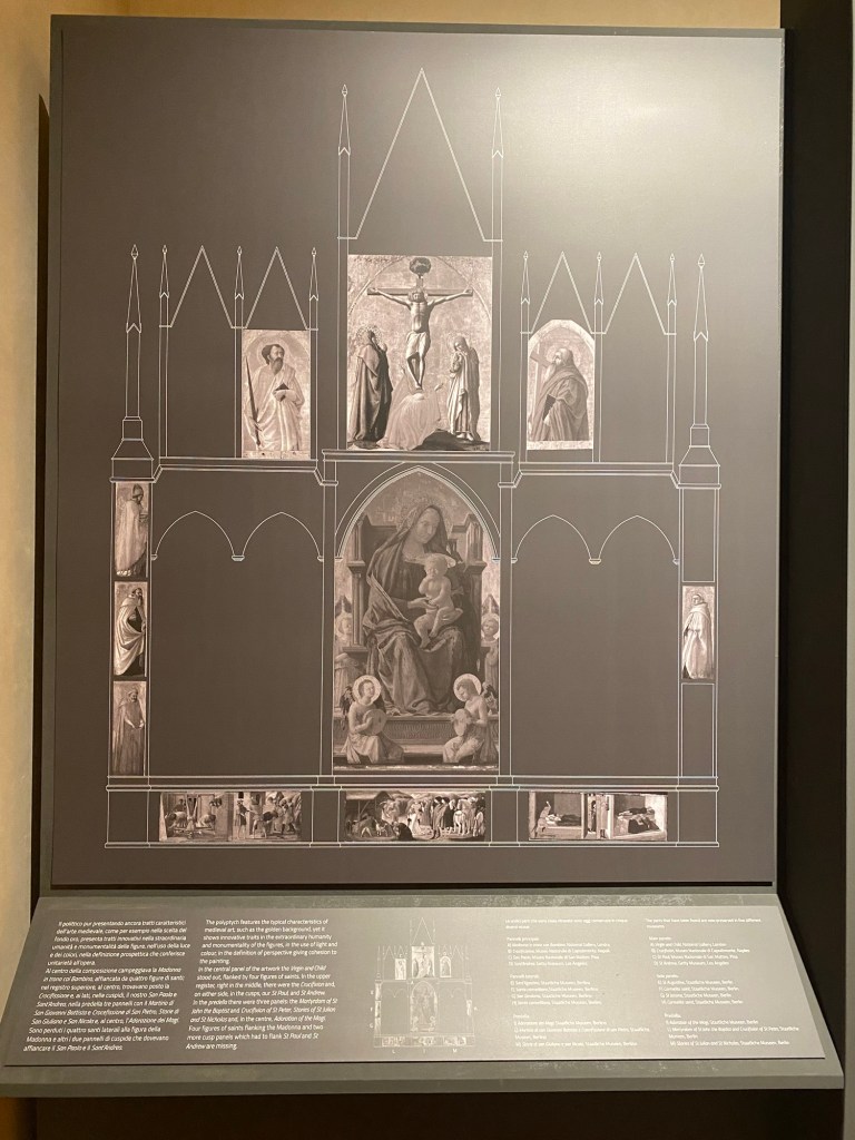What makes the experience of viewing the Masaccio painting even richer is the didactic labels that accompany the work, showing its original placement within an elaborate altarpiece. The altarpiece is dismantled today and many part of it are in different cities/countries, but Pisa is proud to own this impressive work.