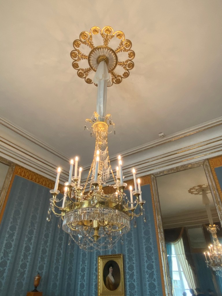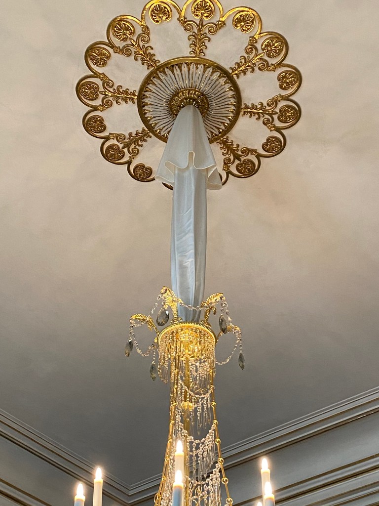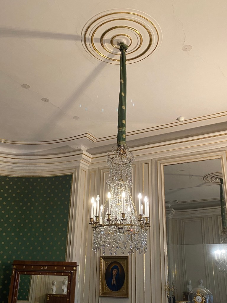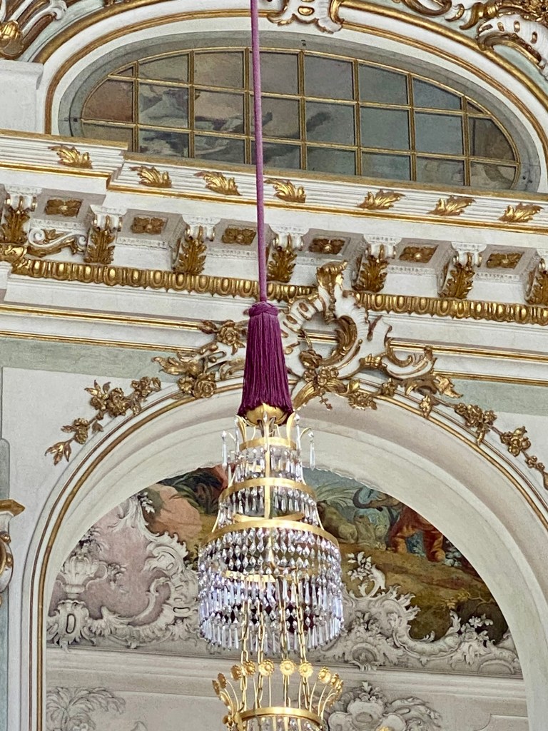 If you read my recent post on the Great Hall at this summer palace, you will recall that I said I was interested in the inventive way the chains/cords holding up the chandeliers are decorated. Here are some other examples of what I saw in the palace, along with a few other miscellaneous interior shots.