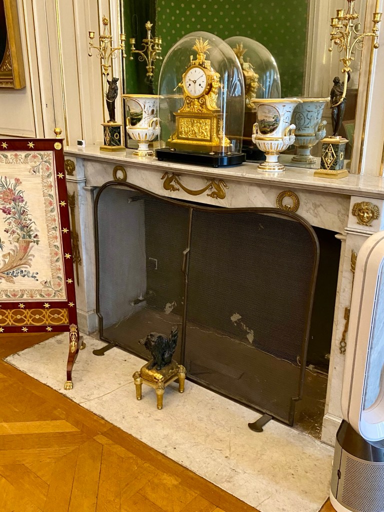 A little bronze kitten sits on a stool in front of the fireplace. I appreciate that someone took the trouble to decorate this room in this way.