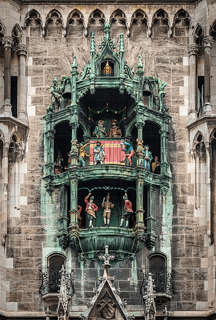 The clock, with 43 bells and 32 life-size figures, was added during the completion of the Neues Rathaus (New Town Hall) in 1908. Every day at 11 a.m. and 12 p.m. (as well as 5 p.m. from March to October) the clock re-enacts two stories from Munich’s history from the 16th century, taking about 15 minutes.