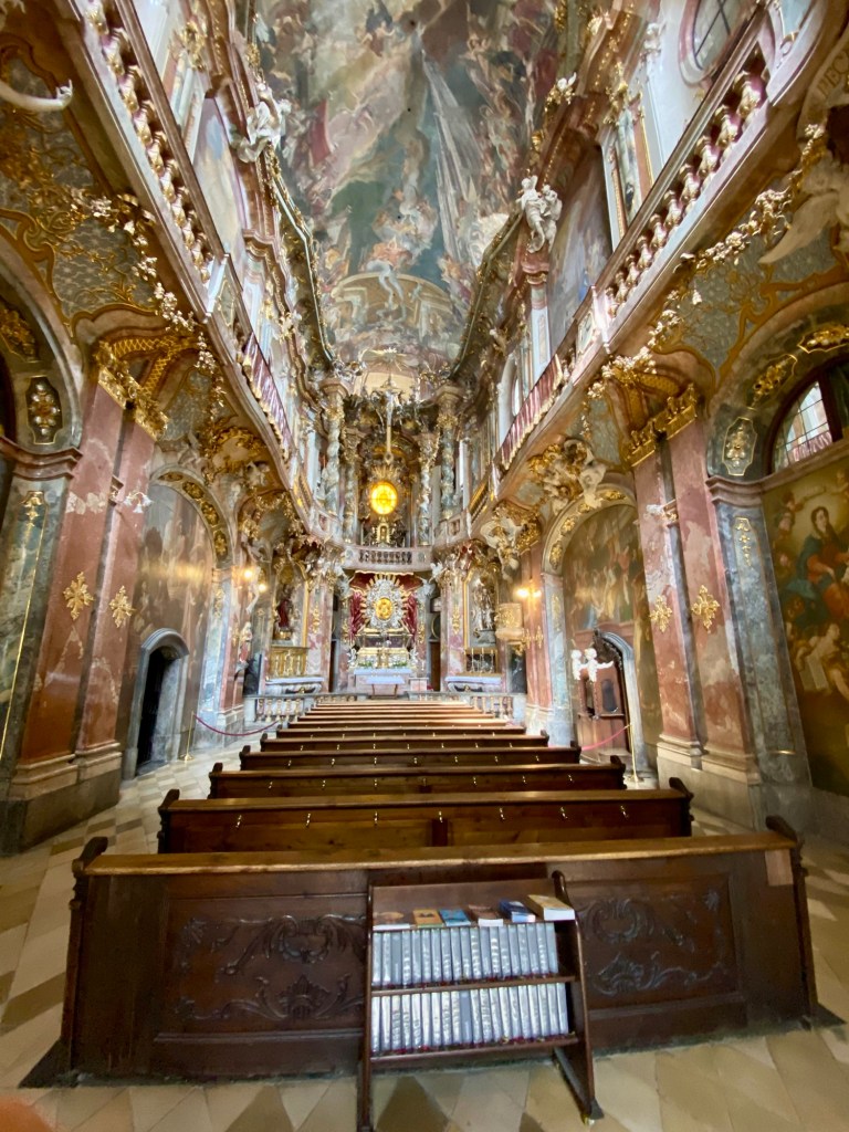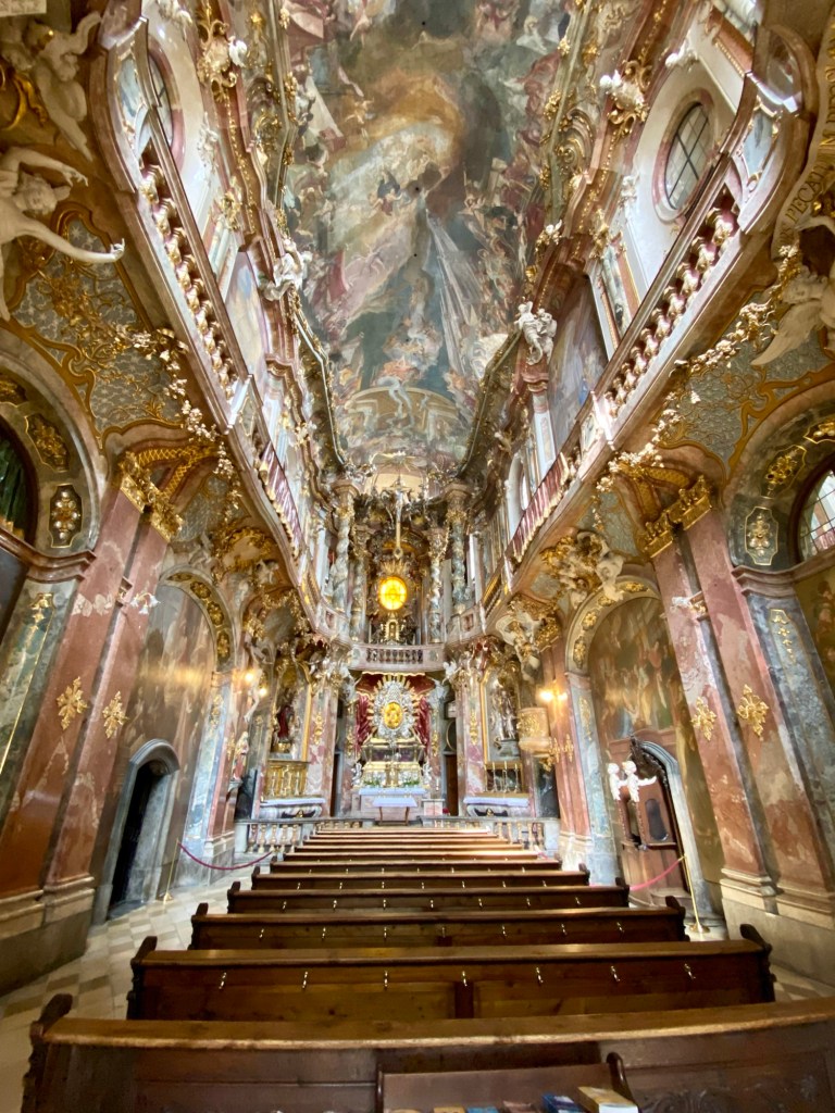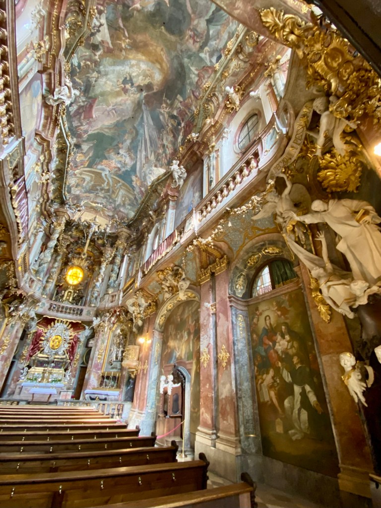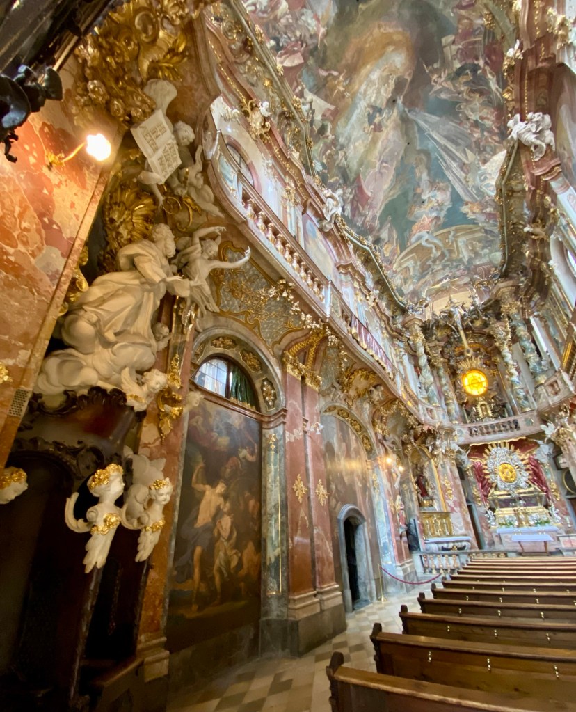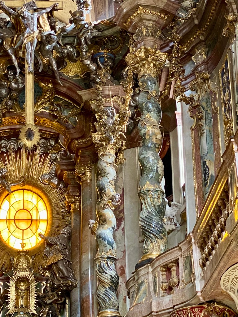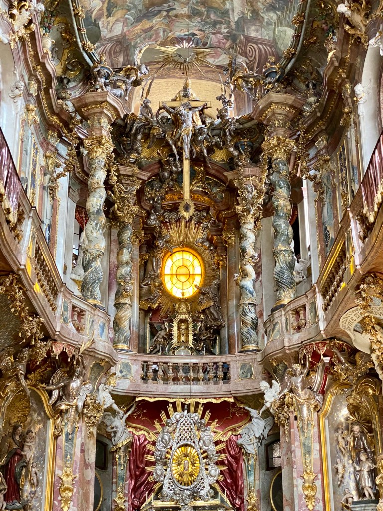 The ceiling fresco Life of Saint Nepomuk is considered a masterpiece of Cosmas Damian Asam. The high altar of the Asam Church is framed by four Solomonic columns. These four columns at the altar recall the four Bernini columns over the grave of St. Peter in St. Peter’s in Rome. Previously, the brothers Asam had studied in Italy at the Accademia di San Luca, under Lorenzo Bernini.