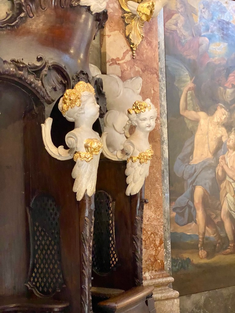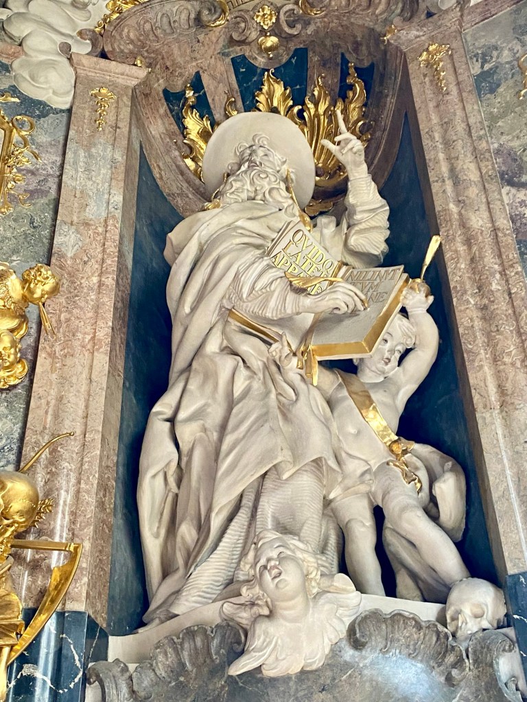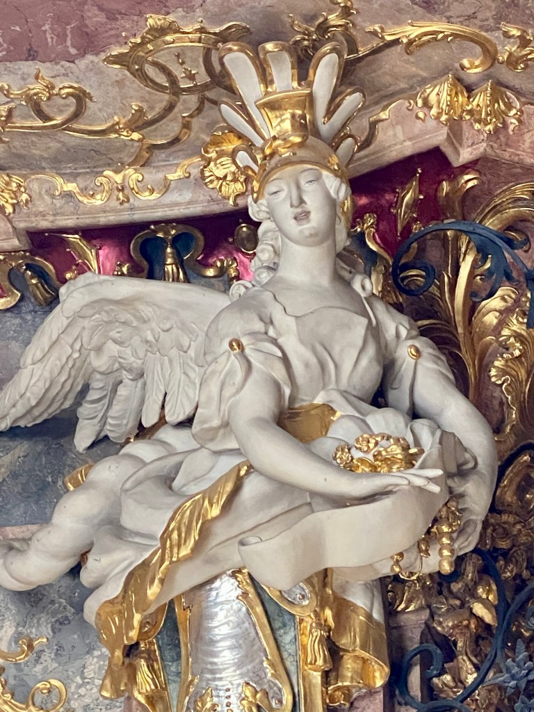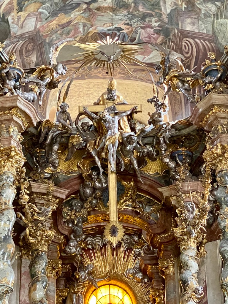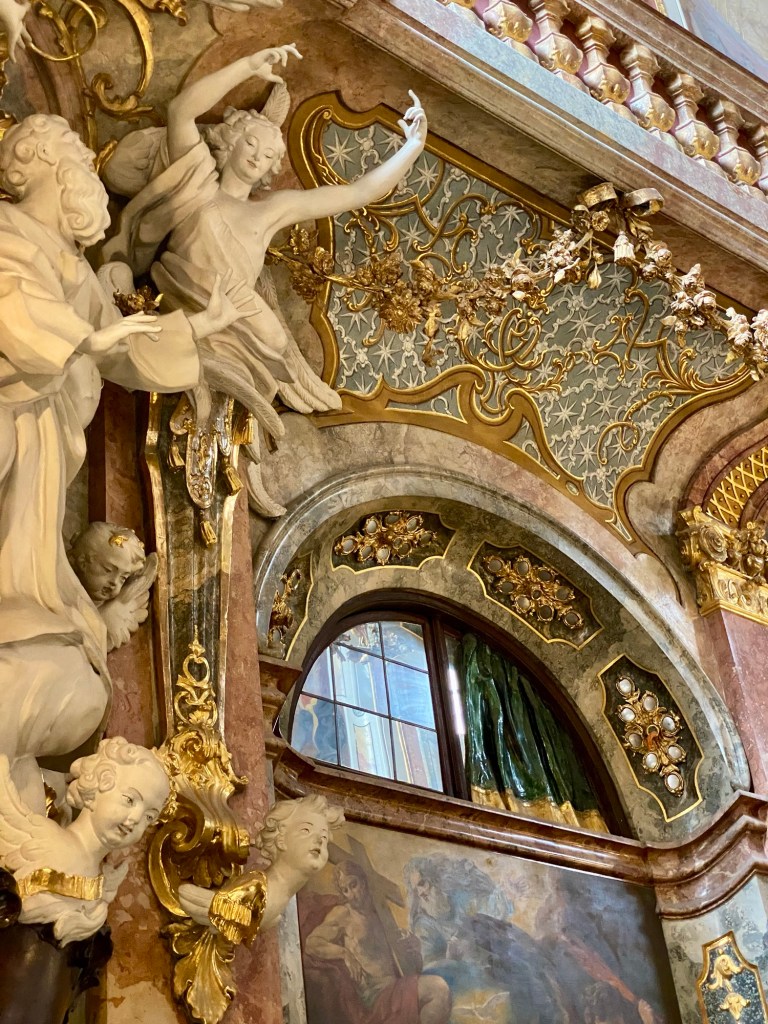 At the top is God, the Saviour. Below the tabernacle, a relic of John of Nepomuk is kept. Two angels, sculpted by Ignaz Günther, flank the gallery altar and were added at a later date.