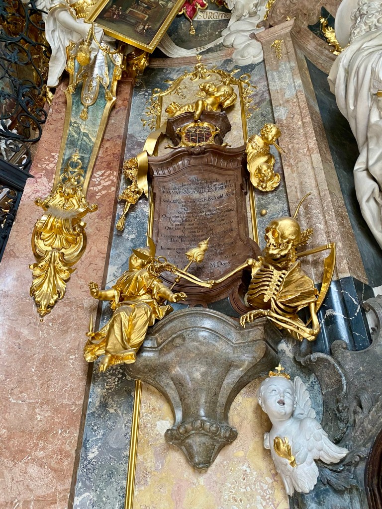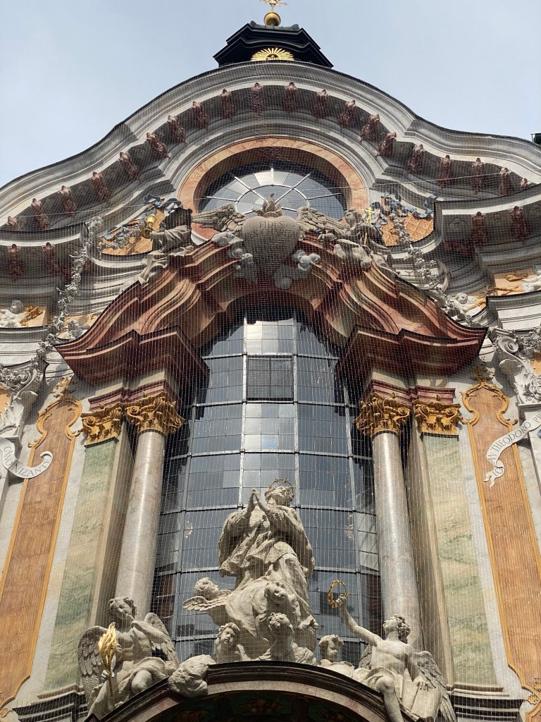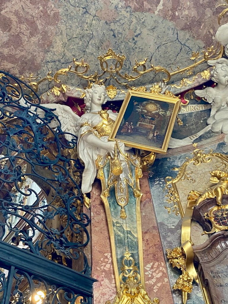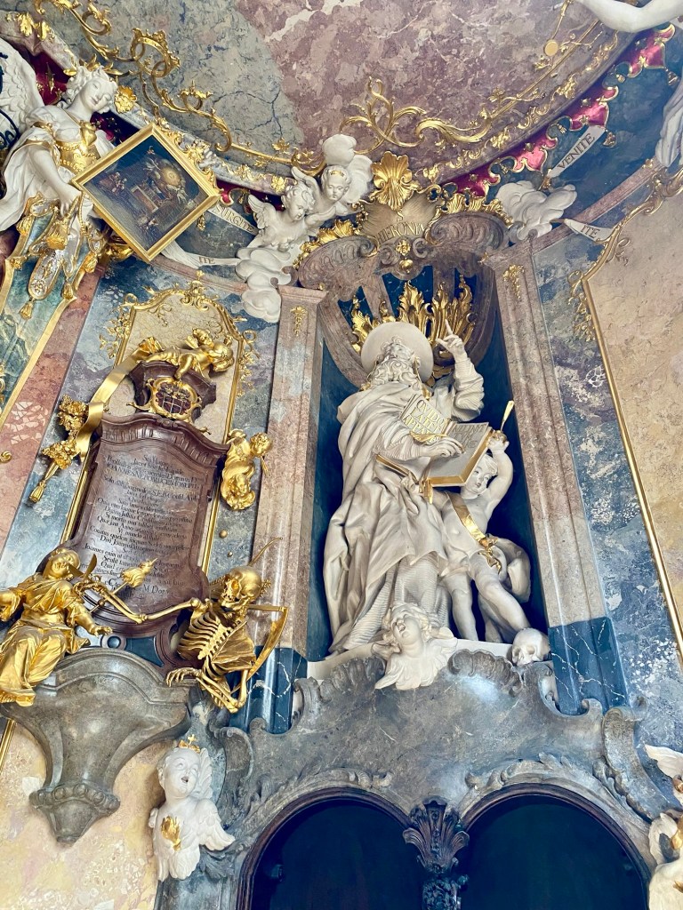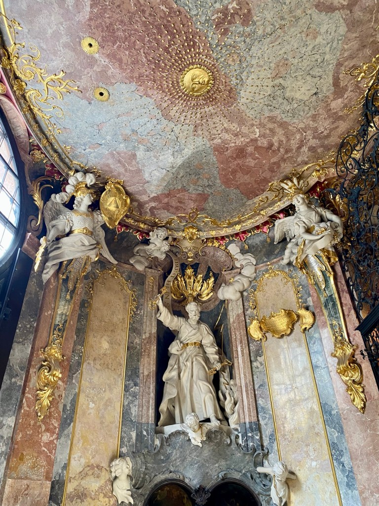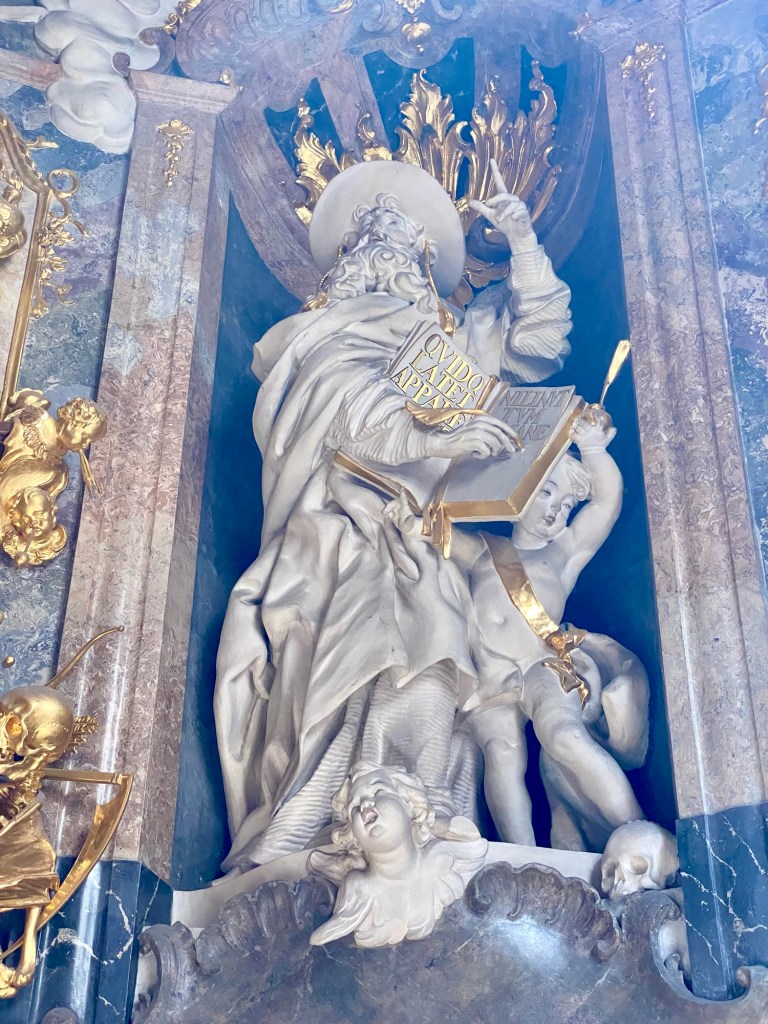 At the top is God, the Saviour. Below the tabernacle, a relic of John of Nepomuk is kept. Two angels, sculpted by Ignaz Günther, flank the gallery altar and were added at a later date.