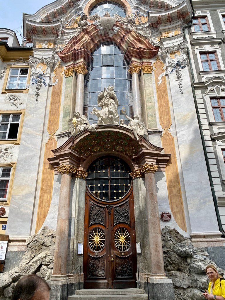 St. Johann Nepomuk was built in a confined space, its property just 22 by 8 m. Even more astonishing is the artistry of the two builders, who were able to harmoniously unite, in a very decorative manner, in the two-story space architecture, painting, and sculpture. The indirect lighting in the choir area is especially well done: hidden behind the cornice window, the Trinity figures are illuminated effectively from behind. The cornice itself seems to swing up and down on its curved construction.