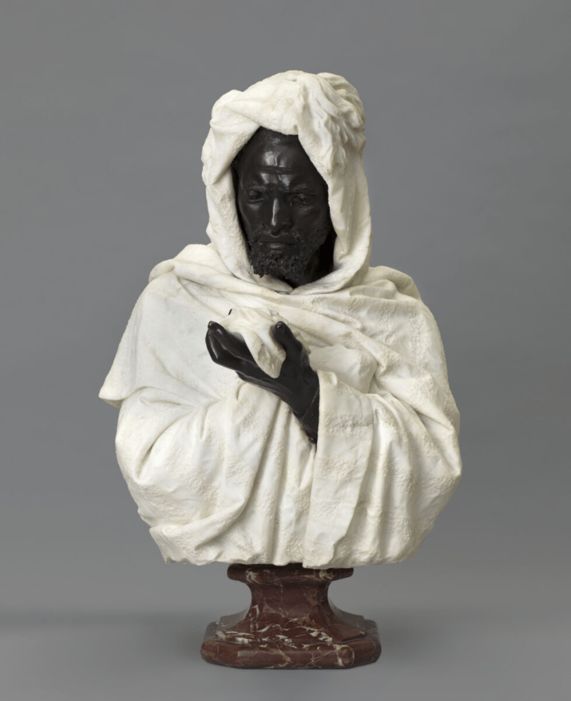 Pietro Calvi was widely recognized during his lifetime for his skill and creativity as a sculptor. Born in Milan in 1833, he studied at the Accademia di Brera, learning techniques for working with both marble and bronze. An interest in ethnography led him to explore the creation of sculptures featuring people or popular characters of color—not a common subject for sculpture in this period. The results were dramatic works that combined white marble with the dark patina of cast bronze, an uncommon and even rebellious approach that moves away from the purity of the white marble works that had long dominated. Calvi’s sculptures were widely exhibited, including at the Parma Exhibition of 1870—a noted, pan-Italian exhibition intended to celebrate the newly unified states of Italy—as well as at the Royal Academy in London, the Paris Salon, and in a number of world’s fairs. In fact, Calvi exhibited pendant busts of “Selika” and “Othello” at the Royal Academy in 1872. In addition to his own works, Calvi also contributed to the sculptural programs of the Galleria Vittorio Emanuele and the Duomo cathedral in Milan. Source: https://www.slam.org/press/saint-louis-art-museum-acquires-calvis-bust-of-selika-a-19th-century-work-complementing-museums-othello/
