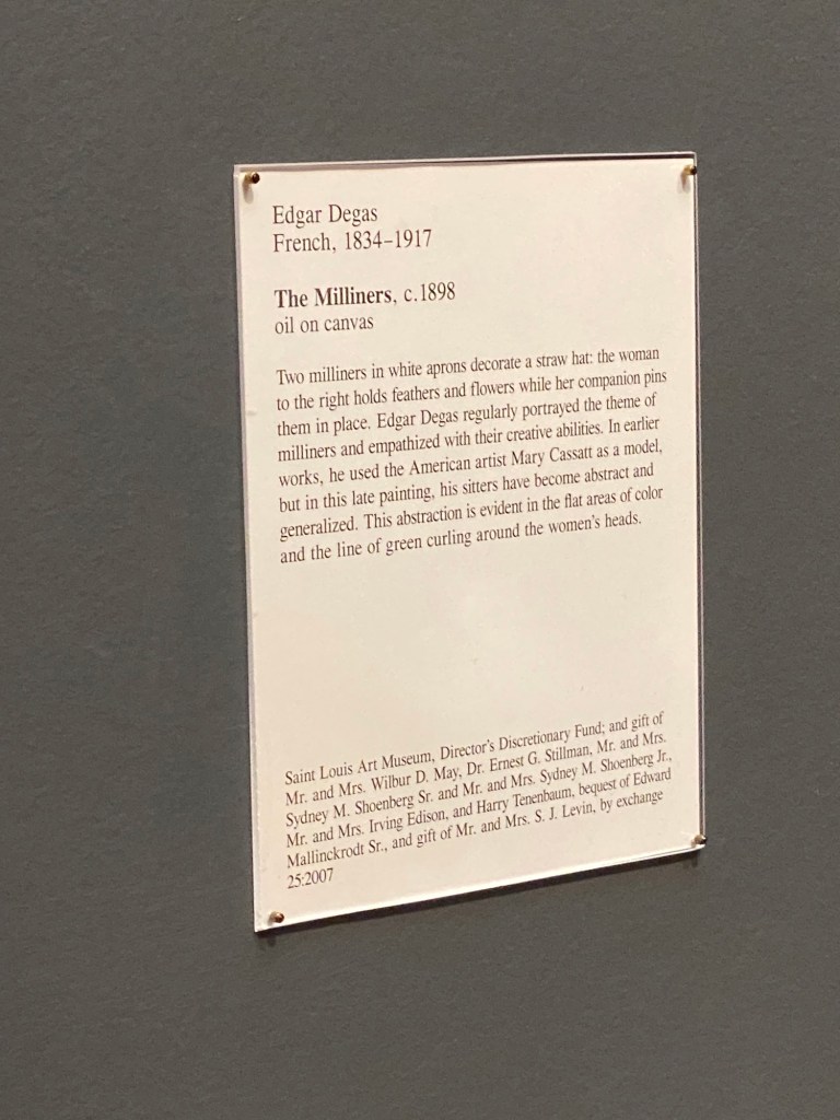 On my recent visit to SLAM, a gallery talk was being held behind Degas’ ballet dancer and right in front of his pastel of The Milliners. Without knocking someone off their stool, I could not get good photos. What you see below is a result of my best efforts.