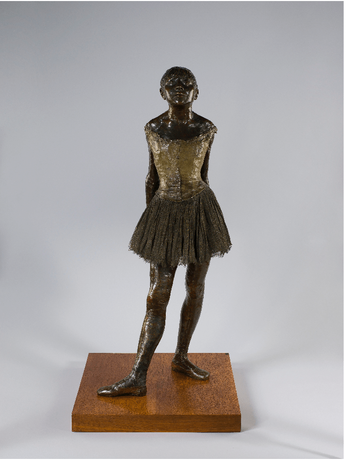 This work is one of many posthumous bronze casts completed after a wax sculpture displayed at the sixth Impressionist exhibition in 1881.The wax figure was the only sculpture that Edgar Degas showed during his lifetime. The artist meticulously created the form of the teenage ballet dancer Marie van Goethem with chin raised and eyes half-closed. The naturalism of the figure was enhanced by the artist’s use of real materials including a muslin dress and satin bow. The stark realism of Degas’ treatment caused the girl’s facial features to be caricatured by critics at the time as “monkey-like.” Art critics: what can you do? An eternal problem.