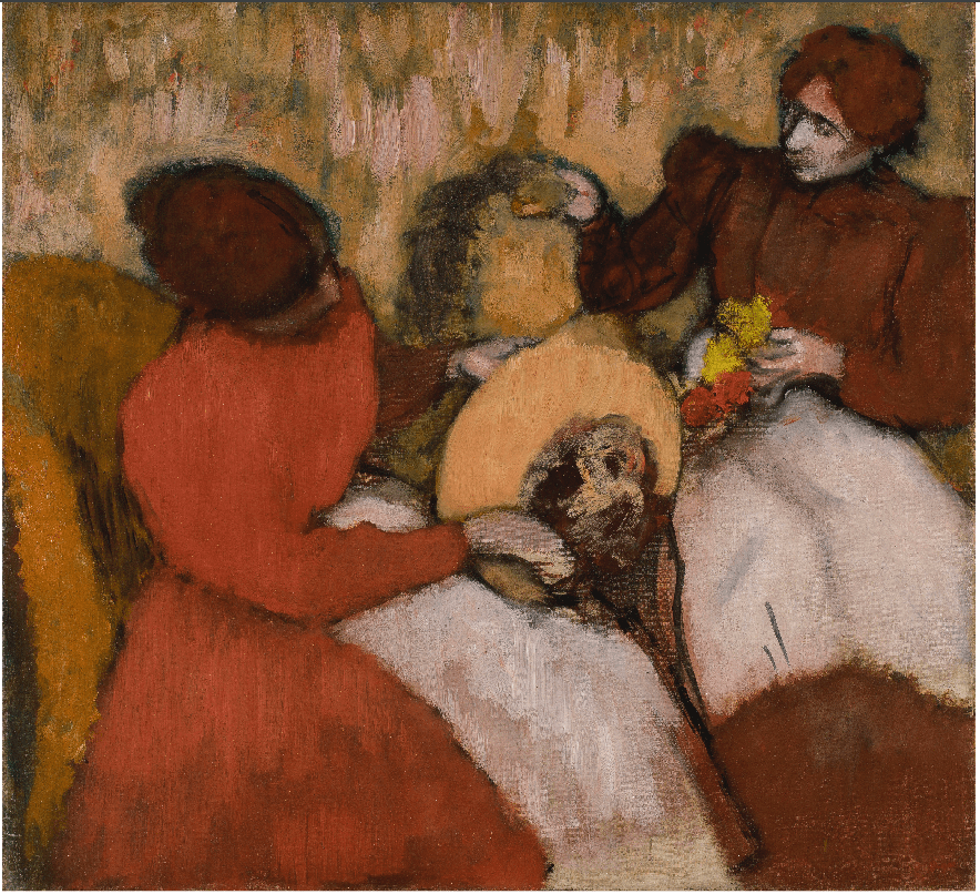 Two milliners in white aprons decorate a straw hat: the woman to the right holds feathers and flowers while her companion pins them in place. Edgar Degas regularly portrayed the theme of milliners and empathized with their creative abilities. In earlier works, he used the American artist Mary Cassatt as a model, but in this late painting, his sitters have become abstract and generalized. This abstraction is evident in the flat areas of color and the line of green curling around the women’s heads.