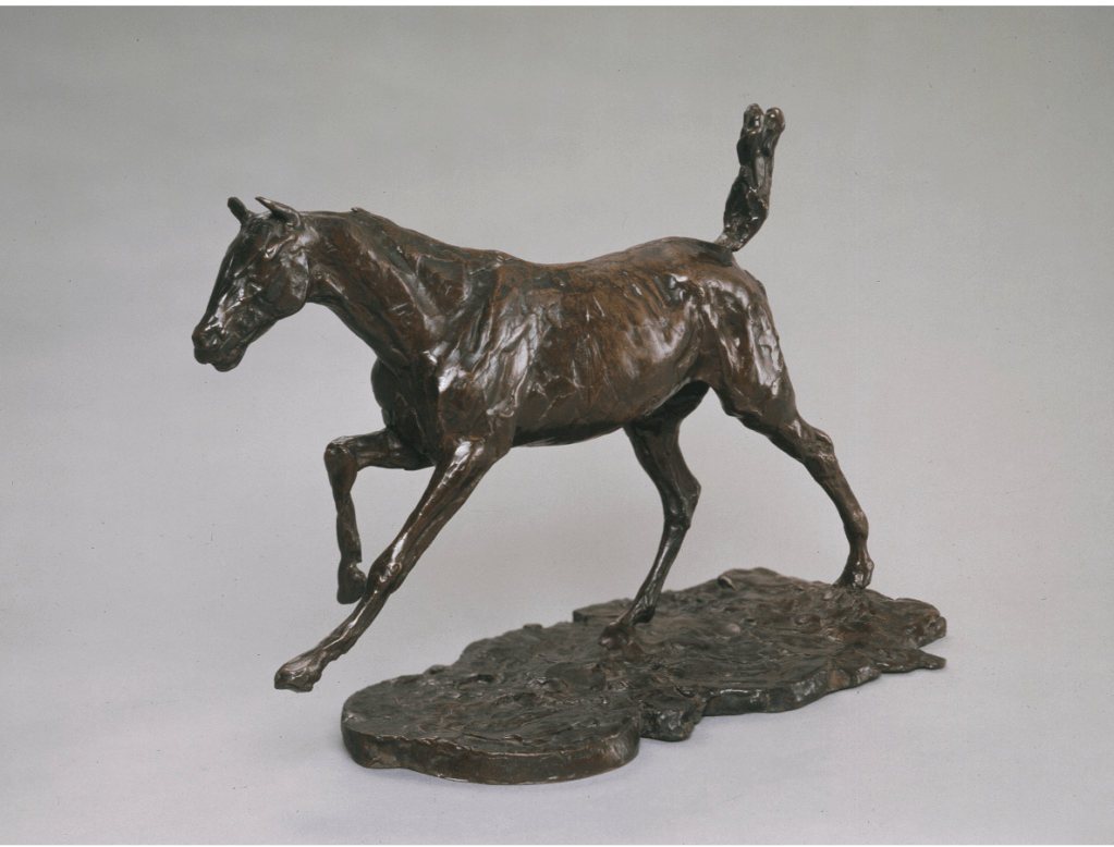 Edgar Degas produced about fifteen sculptures of horses in which he aimed to capture the complexity of horses in motion. A regular visitor to the racetrack, he focused on elegant thoroughbreds rather than workhorses. This sculpture shows a running horse with head intently forward, tail raised, and front legs elevated; Degas succeeds in rendering the energy and tense musculature of the animal. Degas may have been influenced by Eadweard Muybridge’s sequential photographic studies of running horses, published in 1879.