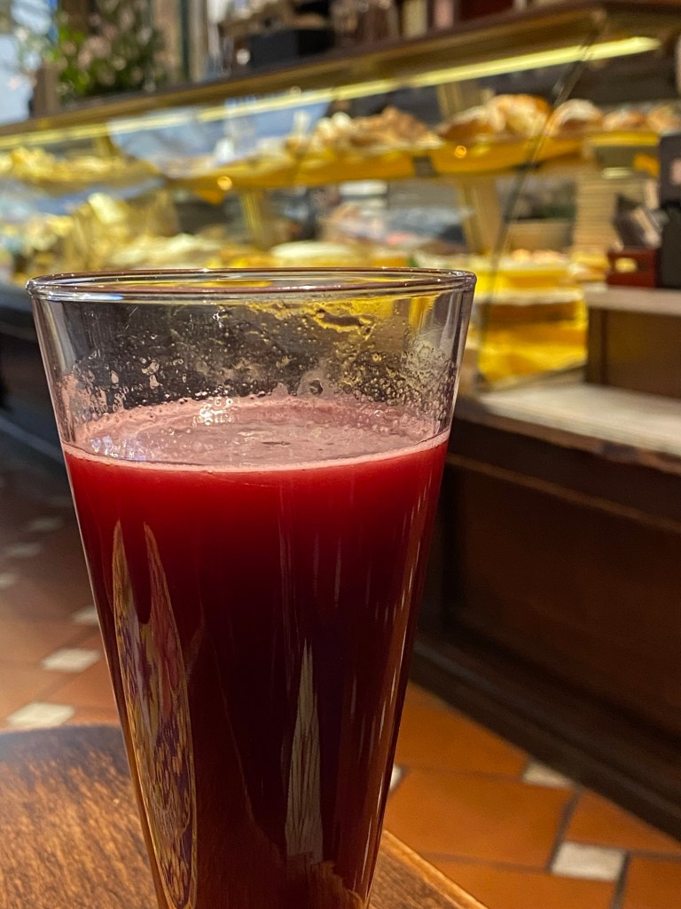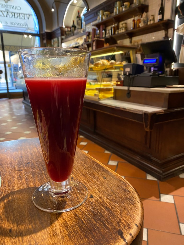 Freshly pressed pomegranate juice. My favorite beverage on planet earth! In my favorite eatery in Florence, certainly in Tuscany, maybe in Italy!