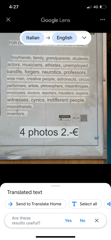 So off I go to a kiosk in the center of town to get the photos. Outside the kiosk they advertise all the reasons why you might want to pay 2Euro to use their kiosk. I took my pictures and while I was waiting for them to develop, I perused the sign. It’s hilarious!