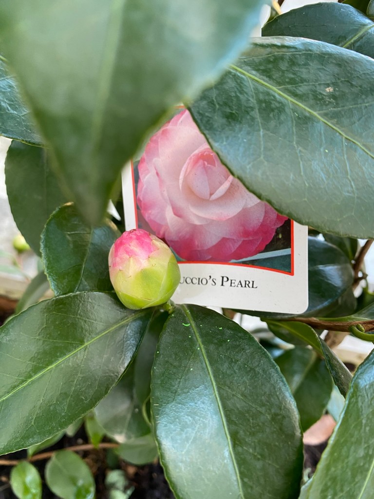 The second shrub I bought, seen below, was this variety, called Nuccio’s Pearl. Isn’t it interesting that the plant label is in English? I’d like it better if it were in Italian. This shrub has many buds and you can be sure I’ll be back with photos as soon as it blossoms. I wonder if it will have the paler center like the photo on the label or whether, like my first shrub, it will be all pink, glorious pink?
