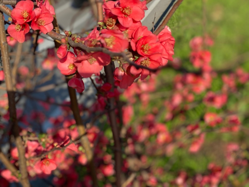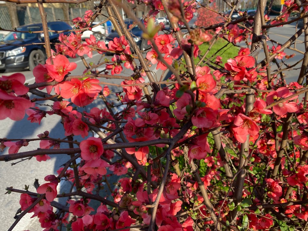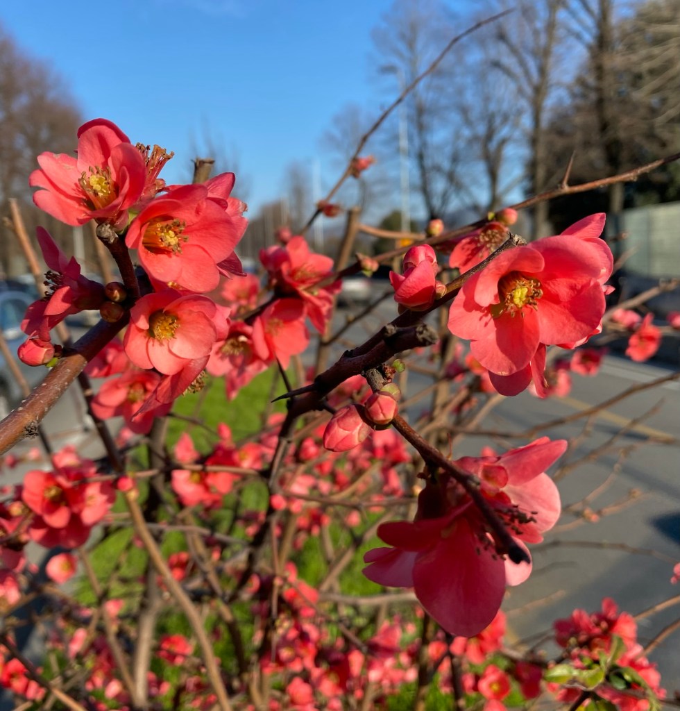 The photos below are of one of my favorite early spring blossoming shrubs: commonly called the flowering quince but beautifully known in Latin as Chaenomeles japonica. I love the bright coral-colored blooms! I grow one in my garden in Denver. It blooms much much later than February in that climate.