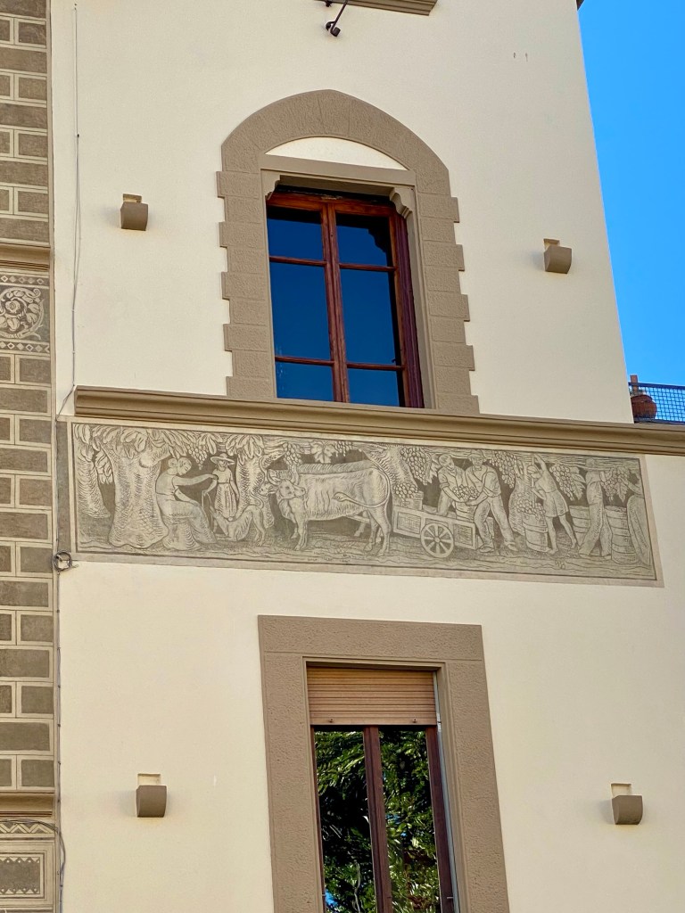 In the frieze we see on the left the matriarch of the family (this is all my supposition) with one of her children. We can only guess that she is as fertile as the farm itself and has many offspring. Sitting in a gladed forest, the wife and her daughter seem to be playing with the family dog. To the right of them stand two healthy Chianina breed steers which are pulling the two wheeled carrozzo, into which workers (could it include the man of the house? I think so because if the two men loading the cart were farmworkers I don’t think the woman and her daughter would be freely sitting near them. It just wouldn’t have happened) are dumping baskets of grapes.