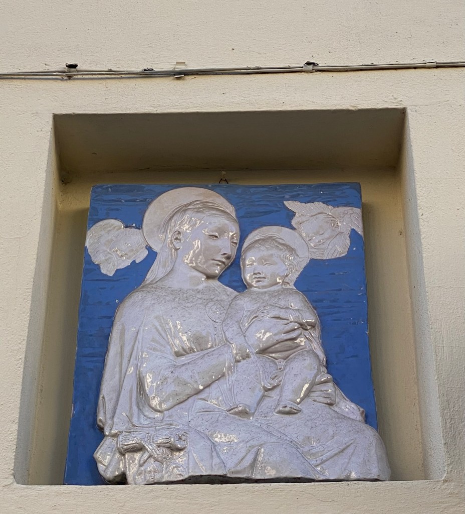 Because this is an Italian home, one needs to add a religious image to make the ensemble complete. In a nod again to the Renaissance, the patron of this building program selected a ceramic relief panel gracefully depicted the Virgin Mary and Christchild. They are attended by 2 cherubim, who provide the figures with some implied heavenly protection. But, beyond the usual subject matter, this work of art makes another reference to the Florentine past: Luca della Robbia (1400-82) was a sculptor from Florence and is noted for his colorful, tin-glazed terracotta statuary, a technique that he invented and passed on.