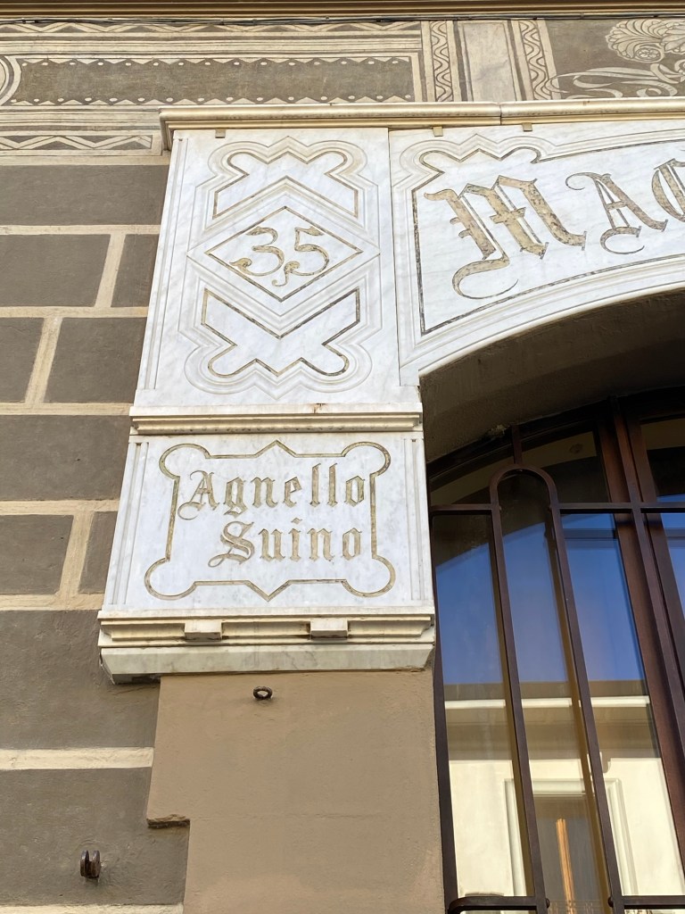The street number of 35 is given above both groups of meat types in an elaborate art nouveau (in Italy the style is known as Liberty) script. Have you ever seen prettier numbers? I haven’t.