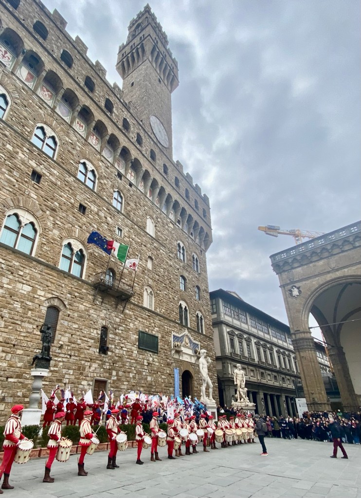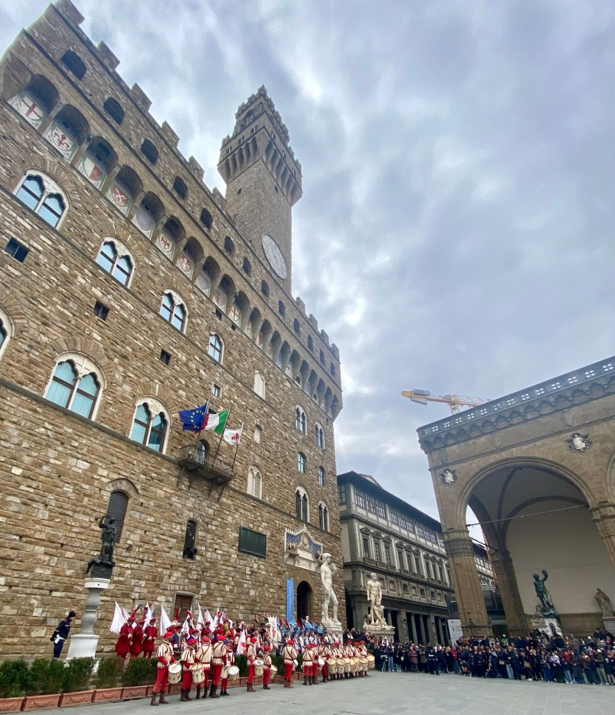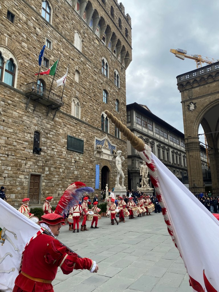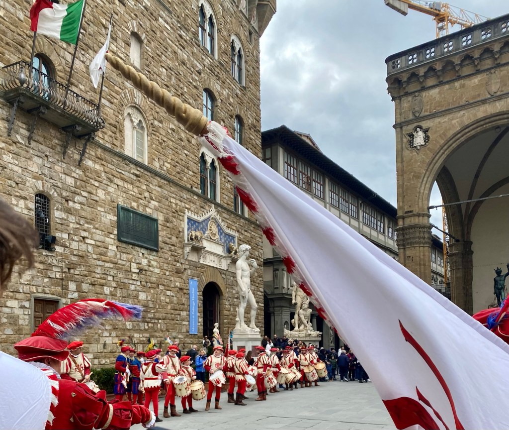 On a recent Sunday morning I was lucky enough to catch this display of an ancient Florentine custom in front of the Palazzo della Signoria.